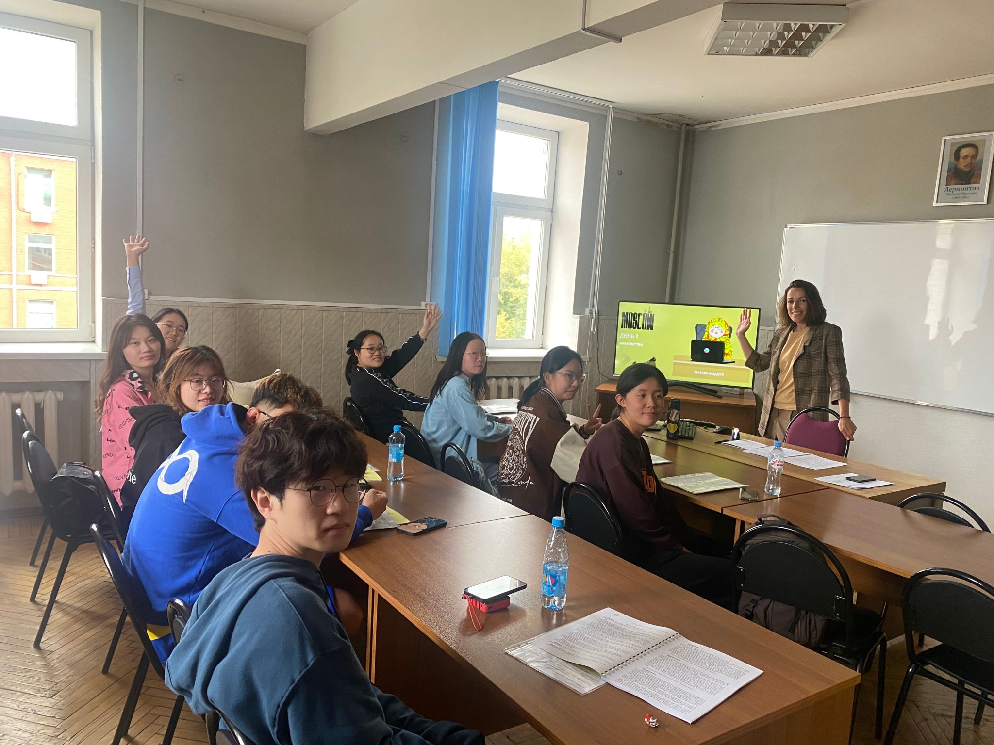 第一天课程的主题是《Знакомство》《认识一下》。在课堂上,老师们寓教于乐,带领同学们以接龙的方式做了简单的自我介绍,并向同学们简单介绍莫斯科的著名景点,如:红场、克里姆林宫、瓦西里升天大教堂、大剧院、特列季亚科夫画廊等。老师们还介绍了具有俄罗斯特色的纪念品:茶炊、套娃等,引导同学们学习地道的俄语表达方式。