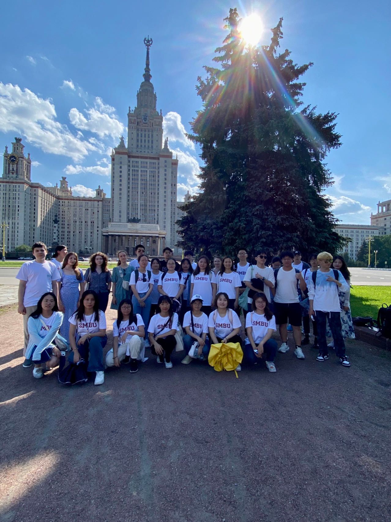 韩丰蔓同学:“与前几日阴雨绵绵的天气不同,7月17日是莫斯科阳光明媚的日子。前两天我们已经参观浏览了莫斯科著名的景点,今天终于到我最期待的莫大之行了,在课堂上我们了解了许多之前不知道的莫大的历史和建筑。这里被称为“城市里的城市”,因为你可以在这里找到所有你需要的,有商店、洗衣房、邮局、理发店、食堂、图书馆、体育馆、音乐厅、植物园等应有尽有。莫大校园是围绕着主楼建造的,主楼是莫斯科有斯大林风格的“七姐妹”建筑里最宏伟的一座,在罗曼诺索夫雕像的左右分别是物理学院和化学学院。美丽的校园坐落于麻雀山上,在这里可以俯瞰莫斯科河和莫斯科市区。这里不仅建筑宏伟壮阔,更是多元文化碰撞发展的文化中心,不同文化背景的人们在此相遇,在国际化的环境中,我们能够从生活中了解不同的生活方式和文化语境。”