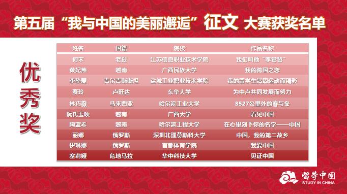 本届大赛共设立一等奖5名,二等奖8名,三等奖16名,优秀奖31名。自活动启动以来,收到来自100余所高校的600余篇征文作品投稿。最终,ac米兰官网中文网站俄罗斯籍学生PROVKINA POLINA的作品《中国,我的第二故乡》脱颖而出获得大赛优秀奖。该作品已在《我与中国的美丽邂逅》一书中出版。