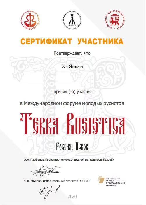 值得一提的是,何艳丽同学还参加了普斯科夫国立大学第三届国际学术会议“世界无国界”暨首届国际青年俄罗斯语言学家论坛。该论坛于去年12月举行,汇集了来自世界许多国家的年轻学者。