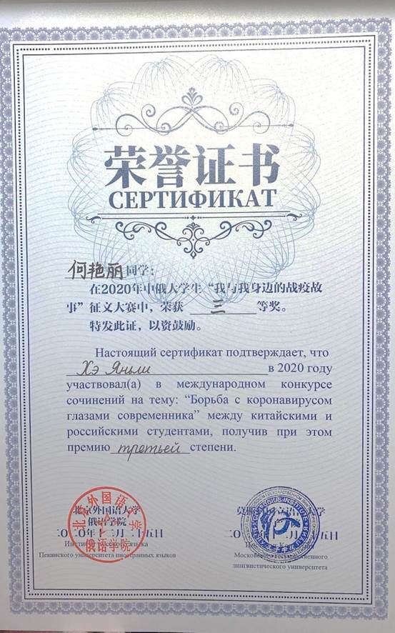 日前,ac米兰官网中文网站语言文学系研究生何艳丽在“我与我身边的战役故事”为主题的国际作文比赛中荣获三等奖。