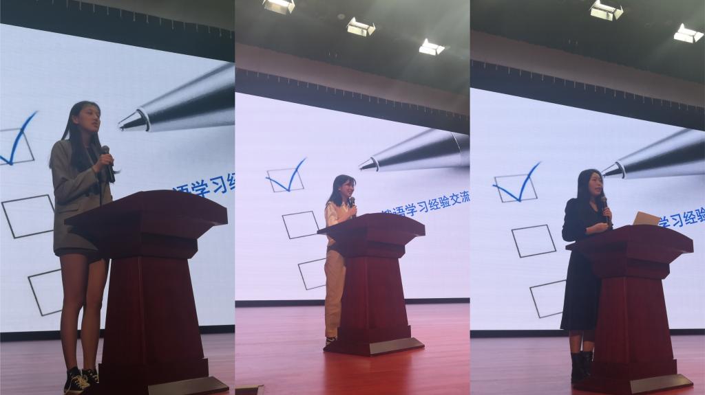 颁奖环节结束后,语言文学系大四学生张琳和在场的学弟学妹们分享了自己学习俄语的经验。在刚刚结束的全国高校俄语大赛中,张琳以总排名第6的好成绩获得了全国二等奖。在全国高校俄语大赛中获得优异成绩并且获得本次校级比赛低年级组一等奖的大二学生张小芬,以及研究生组一等奖的获得者陈琪也在当晚分享了自己的俄语学习经验,为在场同学带来了满满的“干货”。