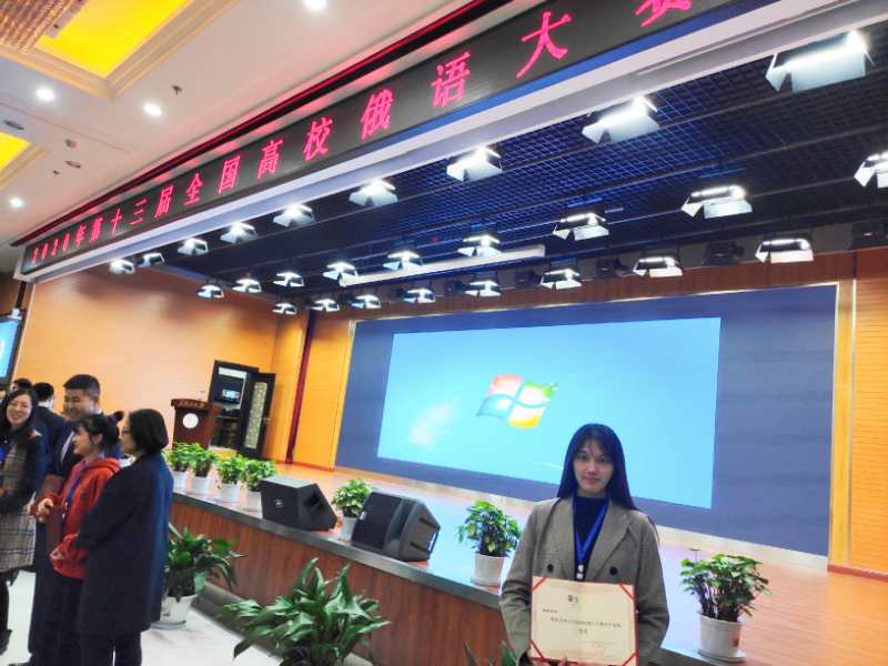 来自语言文学系的大四学生张琳在这场全国顶级俄语赛事中脱颖而出,以仅低于一等奖获得者5分的差距取得高年级组二等奖的好成绩(总排名第六),同时获得由国家留学基金委员会秘书处全额资助赴俄罗斯进修或攻读学位的机会。语言文学系大二学生张小芬同样表现出色,取得低年级组优胜奖,为学校争光添彩。