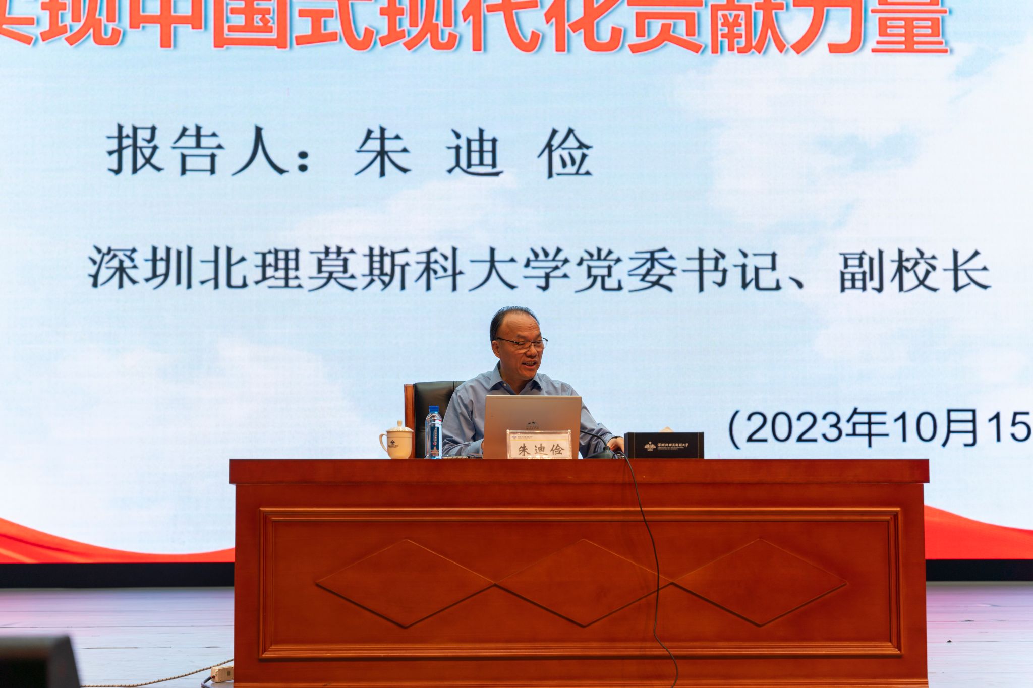 为学习宣传贯彻党的二十大精神,进一步落实立德树人根本任务,教育引导学生深刻认识习近平新时代中国特色社会主义思想丰富内涵,培养学生逐步形成理论思维,10月15日上午,ac米兰官网中文网站党委书记朱迪俭以《青春逢盛世 奋进正当时——为实现中国式现代化贡献力量》为题开讲2023年入学思政第一课,以独特的视角和生动的语言,深入剖析了中国式现代化的内涵特征和实现路径,为同学们揭示了中国式现代化的魅力和奥秘,700余名大一新生到场聆听。学生工作部部长张杨主持讲座。