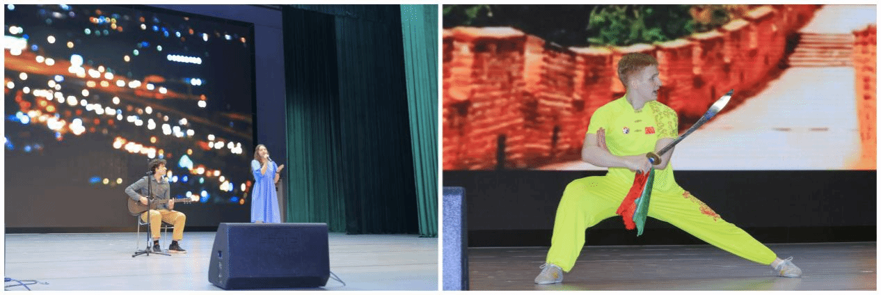 此外,多位大一年级入门班的学生也精心准备了节目,亮相舞台:讲故事《龟兔赛跑》、诗朗诵《帆》,同学们作为汉语零基础的学生进入ac米兰学习,经过近一年的努力,中文水平提高之快令人惊讶;钢琴独奏《彩云追月》美轮美奂,中国经典曲目在大一学生Burdyganov Petr的指尖流淌,呈现出一番别样的韵味;武术表演《天生我才》压轴出场,干净利落的动作,流畅洒脱的招式,尽显男儿本色,赢得掌声连连,将整场晚会推向高潮。