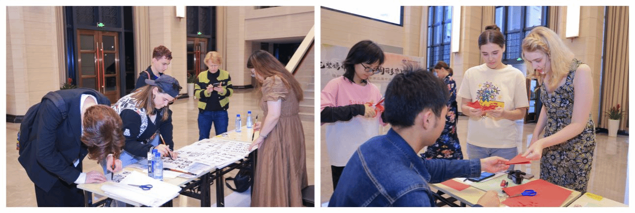 晚上18点30分中国文化小集市热闹开张。学校书法社和手工社的同学带领中俄师生一起写汉字、剪兔子。在一笔一画,一刀一剪中,感受中文和中国文化的魅力。