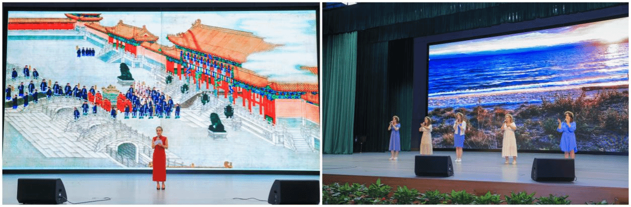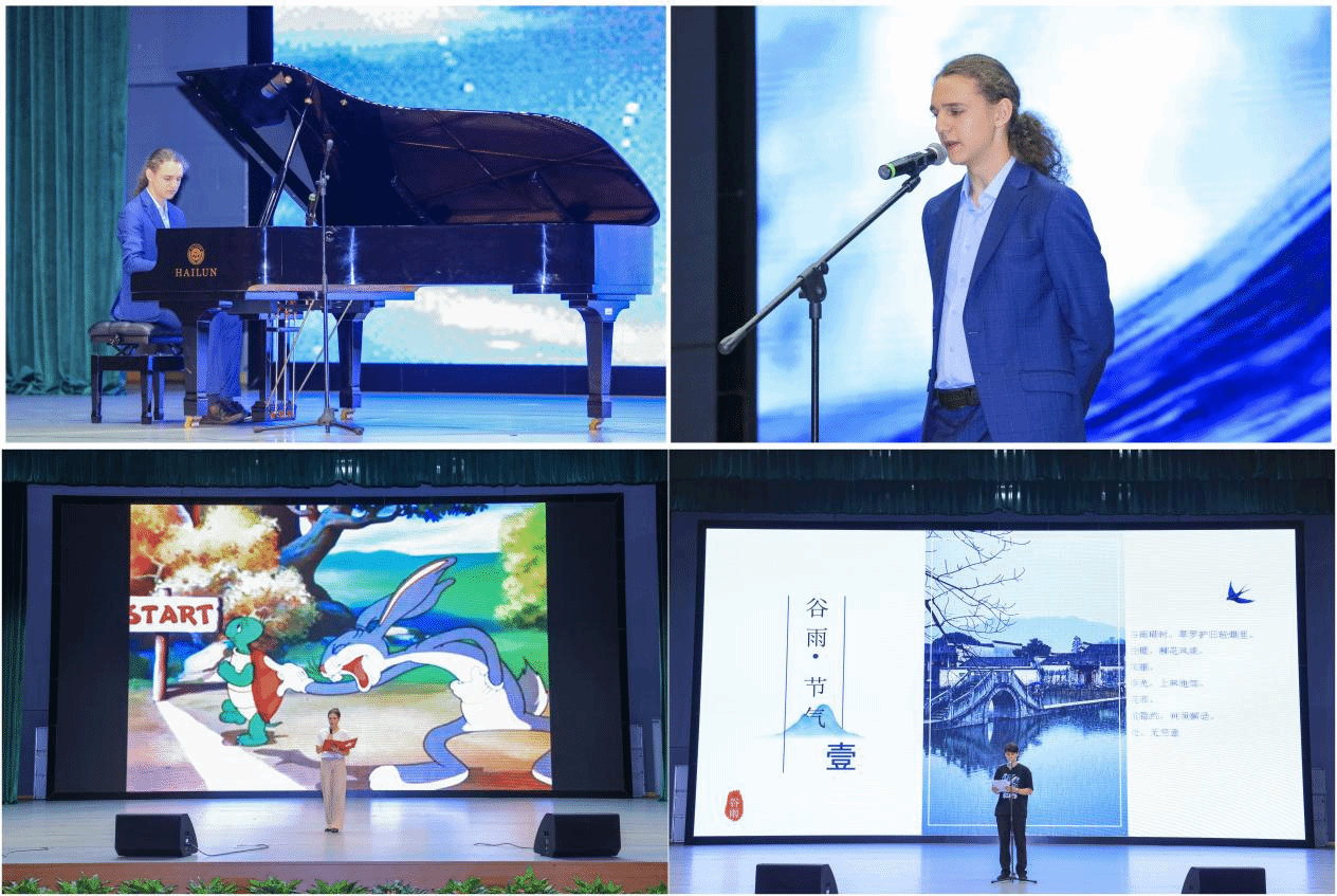 当晚歌曲类节目十分精彩。经典名曲《莫斯科郊外的晚上》《贝加尔湖畔》《妈妈的话》《我们不一样》轮番登场,同学们落落大方,咬字清晰,优美的歌声令人沉醉,赢得阵阵掌声。语言类节目也毫不逊色。 散文及诗朗诵《谷雨》《再别康桥》《南方的夜》《木兰诗》,国际学生们用流利的中文演绎经典,表达自己对中文作品的理解。《美人为馅》电视剧选段配音、童话剧《南瓜》形式新颖,别出心裁,令人印象深刻。