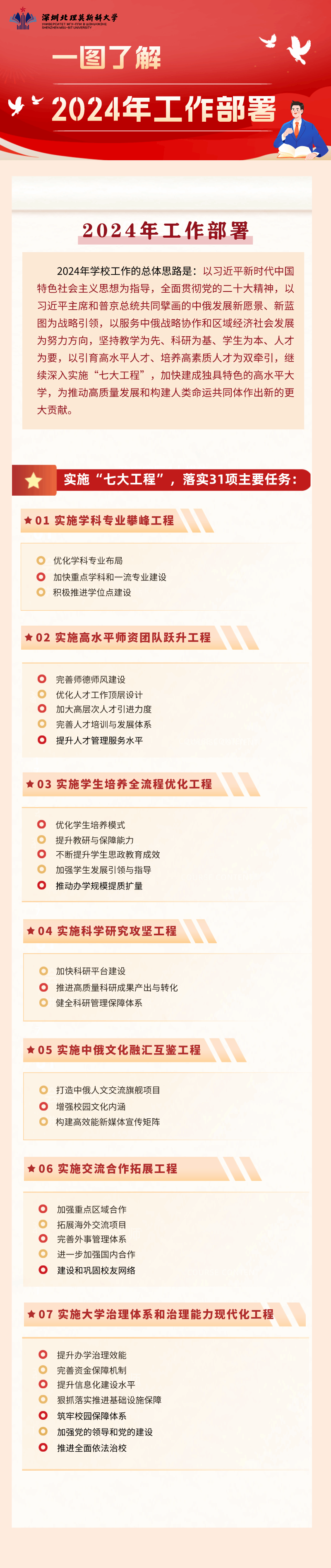 报告指出,2024年学校工作的总体思路是:以习近平新时代中国特色社会主义思想为指导,全面贯彻党的二十大精神,以习近平主席和普京总统共同擘画的中俄发展新愿景、新蓝图为战略引领,以服务中俄战略协作和区域经济社会发展为努力方向,坚持教学为先、科研为基、学生为本、人才为要,以引育高水平人才、培养高素质人才为双牵引,继续深入实施“七大工程”,加快建成独具特色的高水平大学,为推动高质量发展和构建人类命运共同体作出新的更大贡献。报告围绕实施学科专业攀峰工程、高水平师资团队跃升工程、学生培养全流程优化工程、科学研究攻坚工程、中俄文化融汇互鉴工程、交流合作拓展工程、大学治理体系和治理能力现代化工程“七大工程”31项任务进行详细部署。