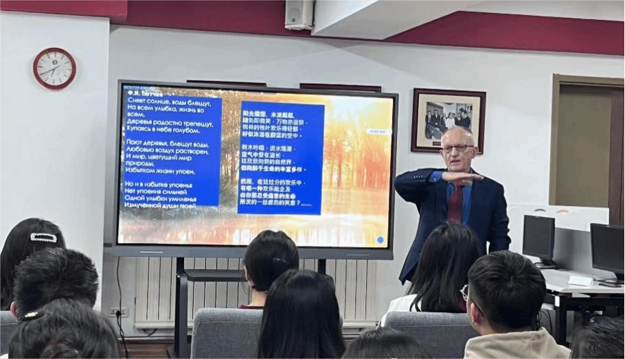 会见结束后,伊万琴科一行参观了图书馆、俄语中心,并与俄语学院师生开展讲座与座谈。俄语中心领导会见伊万琴科一行,双方就两校教育模式与学生培养以及学术科研合作等相关领域工作进行交流。
