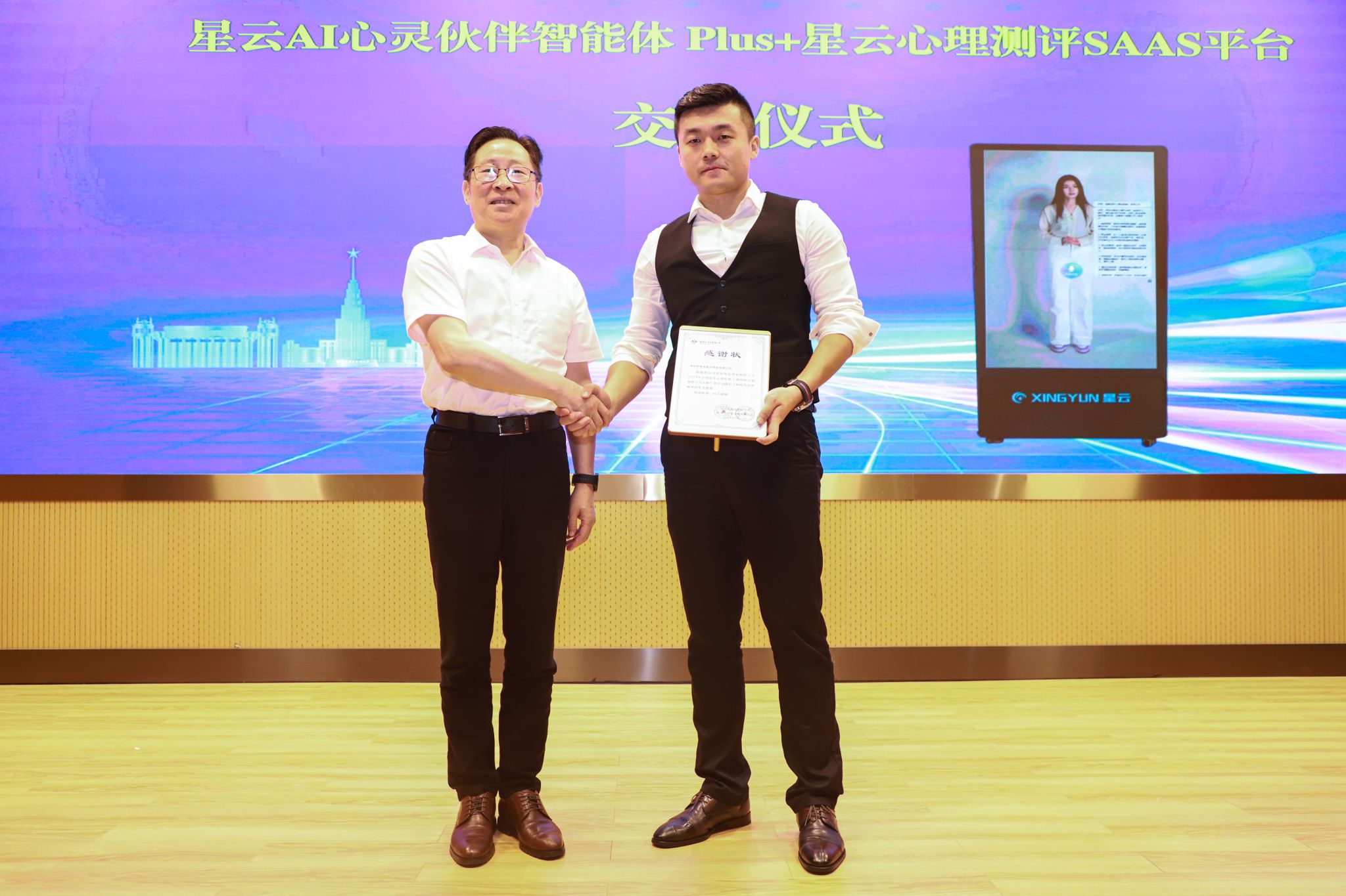 抢答活动结束后,深圳市健成星云科技有限公司向ac米兰官网中文网站心力成长中心刘铁榜工作室捐赠星云AI心灵伙伴智能体 Plus+星云心理测评SAAS平台,公司CEO王喆莅临交付仪式并做产品介绍,刘铁榜向捐赠企业颁发感谢状。