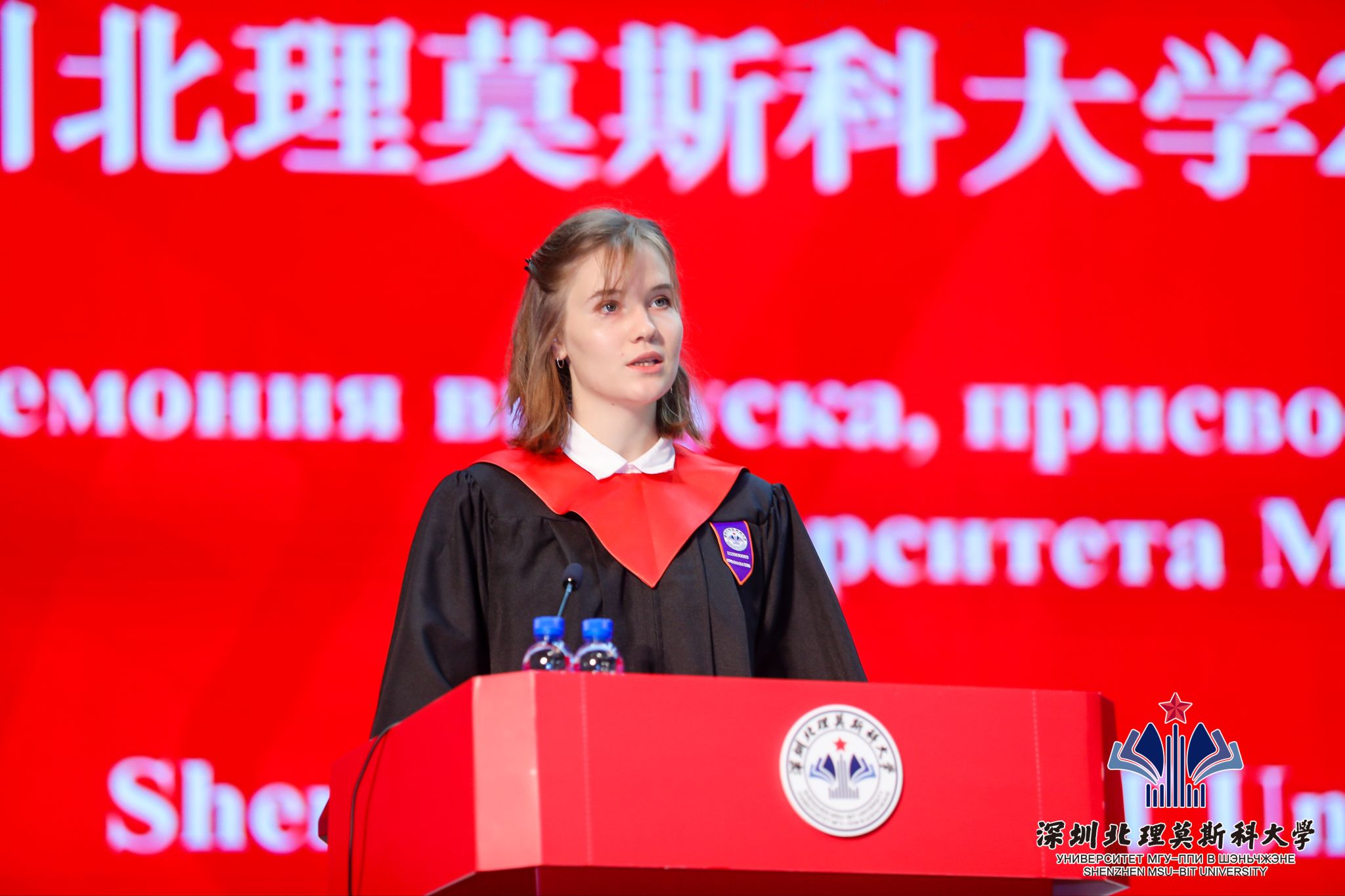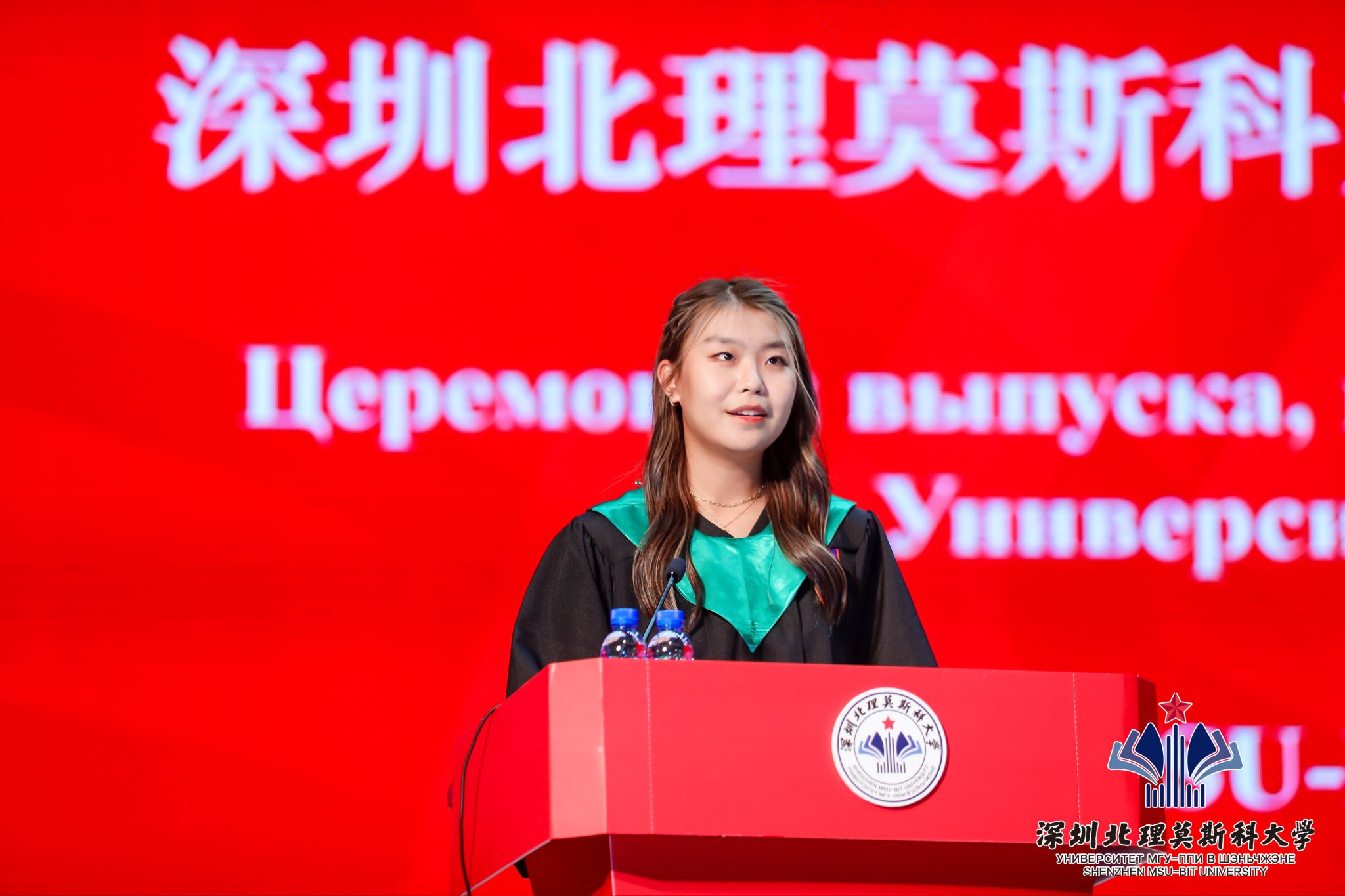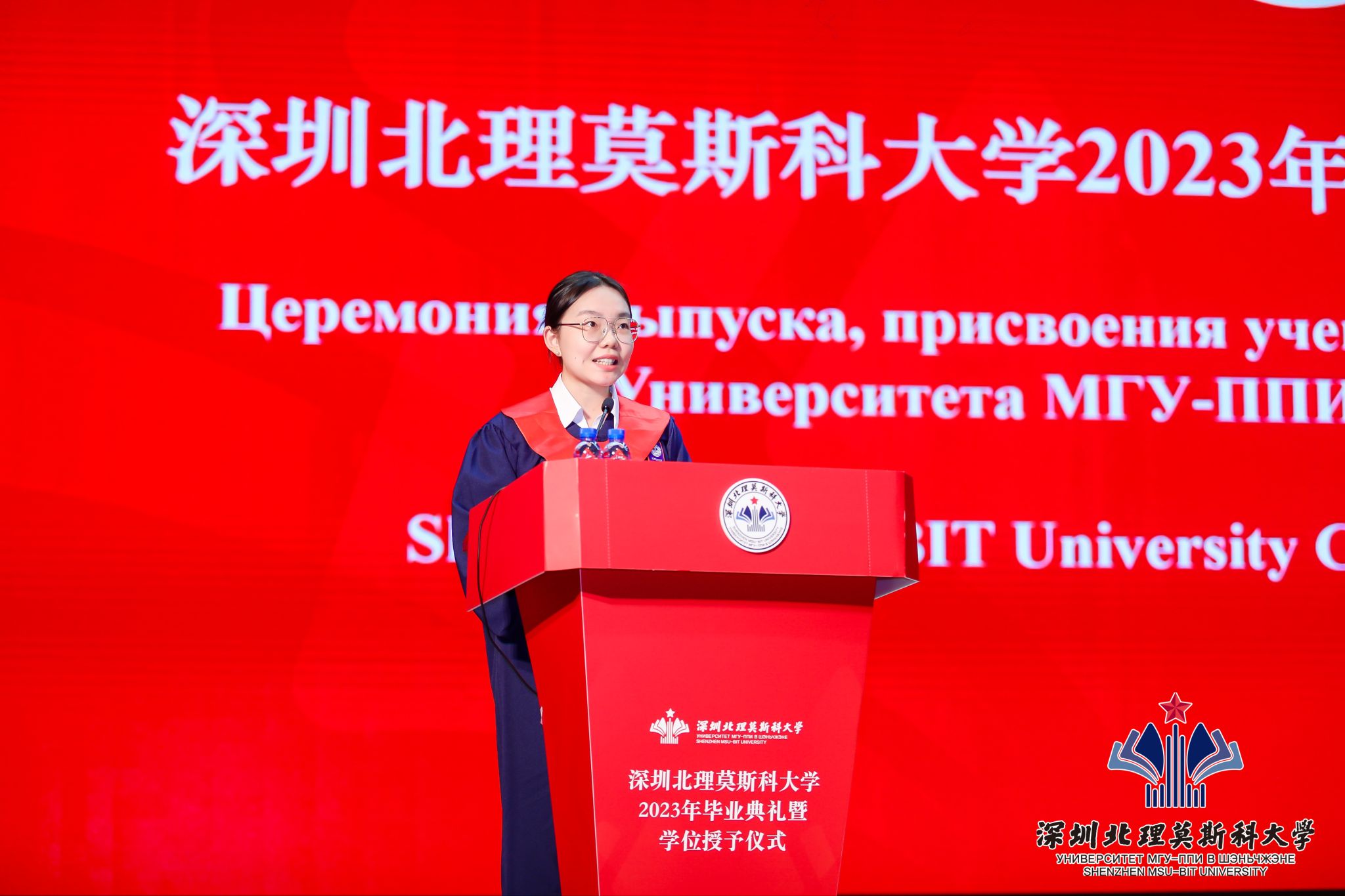 2019级生物系学生樊星儿代表本科毕业生发言。她带领同学们回溯了欢笑、汗水与眼泪交织的大学四年生活,向精心育才的母校、向桃李不言的老师、向辛勤操劳的父母致以最诚挚的感谢,向四年相识相知相伴的同窗表达最真诚的祝福。“今天之后我们即将跃入人海,各有风雨灿烂。期待我们带着成为中俄知识、科学和文化传播使者的使命担当,在世界的各个角落发热发光。”樊星儿说。