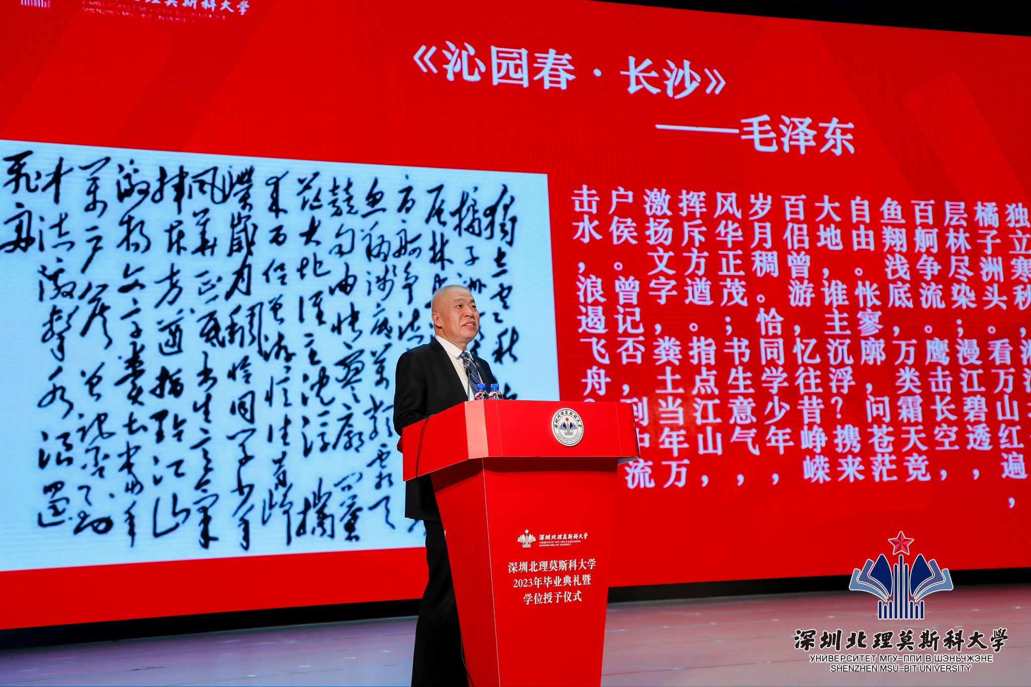 最后,李和章校长还邀请全场毕业生与他一起重温毛泽东主席1925年作的词《沁园春·长沙》,李和章校长勉励同学们要始终保持真心、真信、真行,凝聚奔向未来的力量,到中流击水,在新时代新征程中书写昂扬壮美的青春华章。