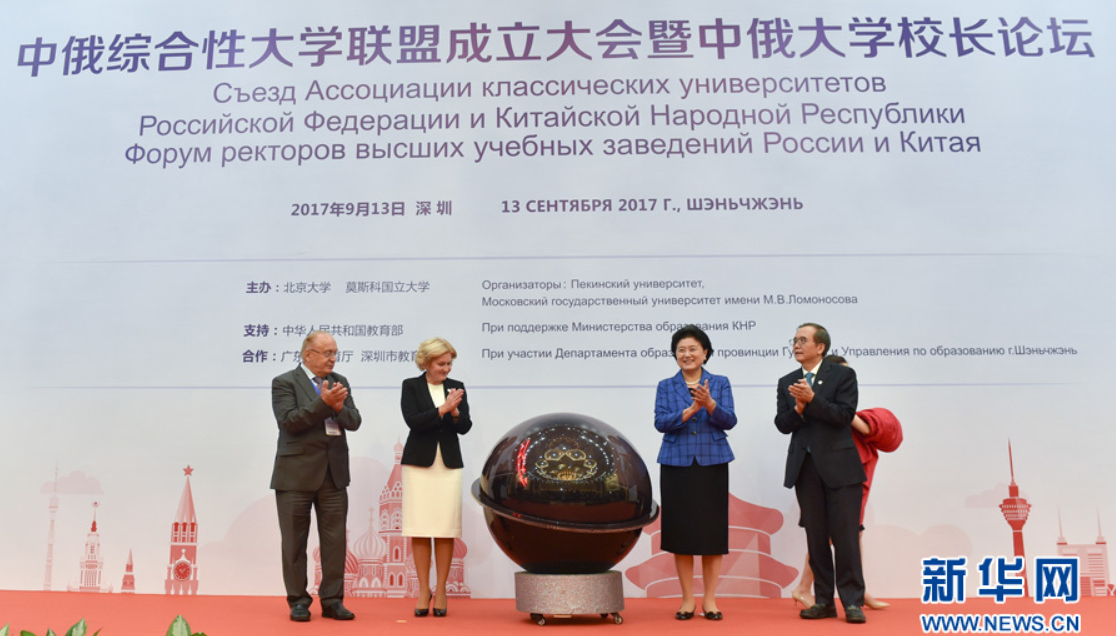 9月13日,中国国务院副总理、中俄人文合作委员会中方主席刘延东在深圳与俄罗斯副总理、委员会俄方主席戈洛杰茨共同出席中俄综合性大学联盟成立大会暨中俄大学校长论坛。新华社记者 毛思倩 摄