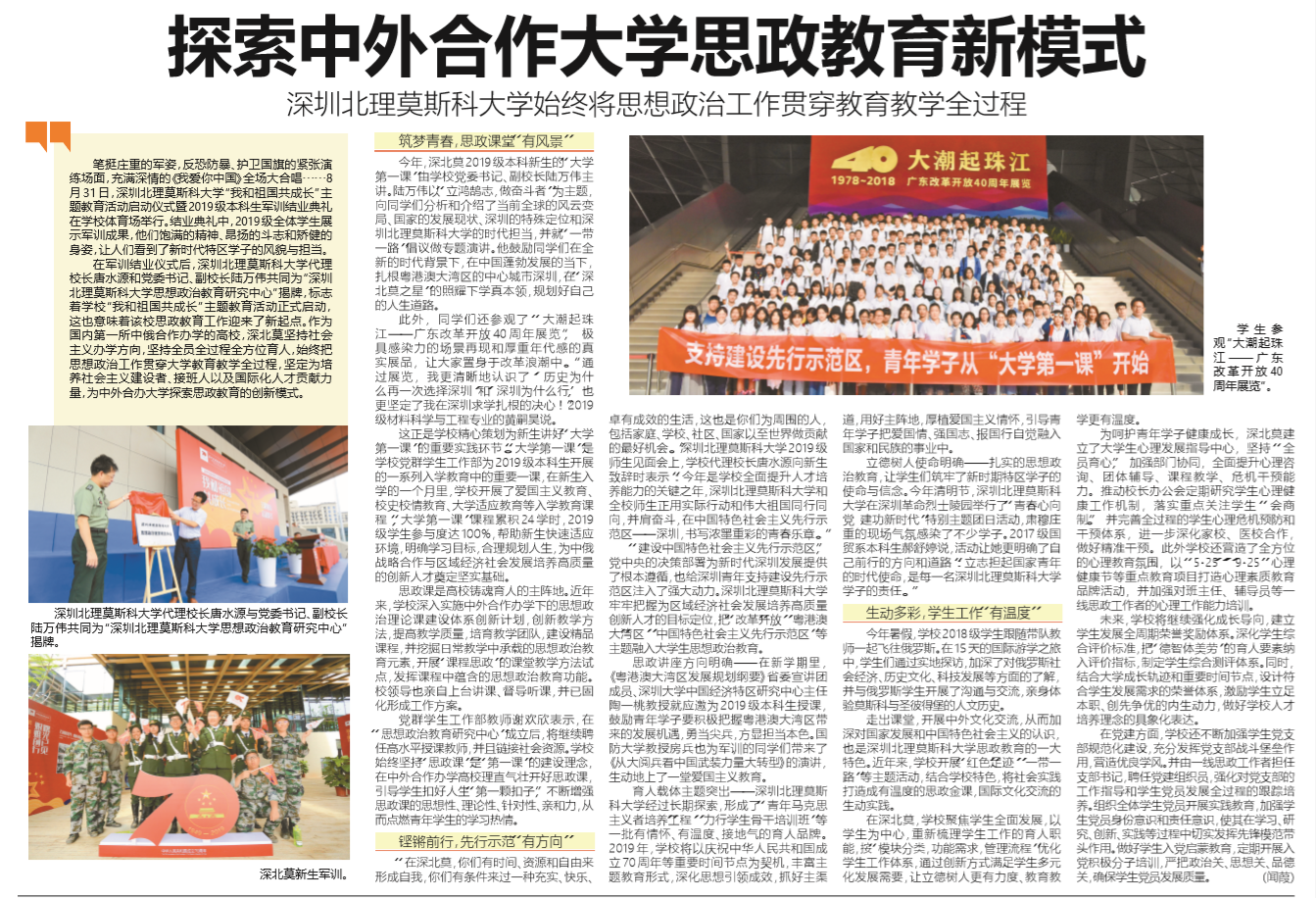 思政讲座方向明确——在新学期里,《粤港澳大湾区发展规划纲要》省委宣讲团成员、深圳大学中国经济特区研究中心主任陶一桃教授就应邀为2019级本科生授课,鼓励青年学子要积极把握粤港澳大湾区带来的发展机遇,勇当尖兵,方显担当本色。国防大学教授房兵也为军训的同学们带来了《从大阅兵看中国武装力量大转型》的演讲,生动地上了一堂爱国主义教育。