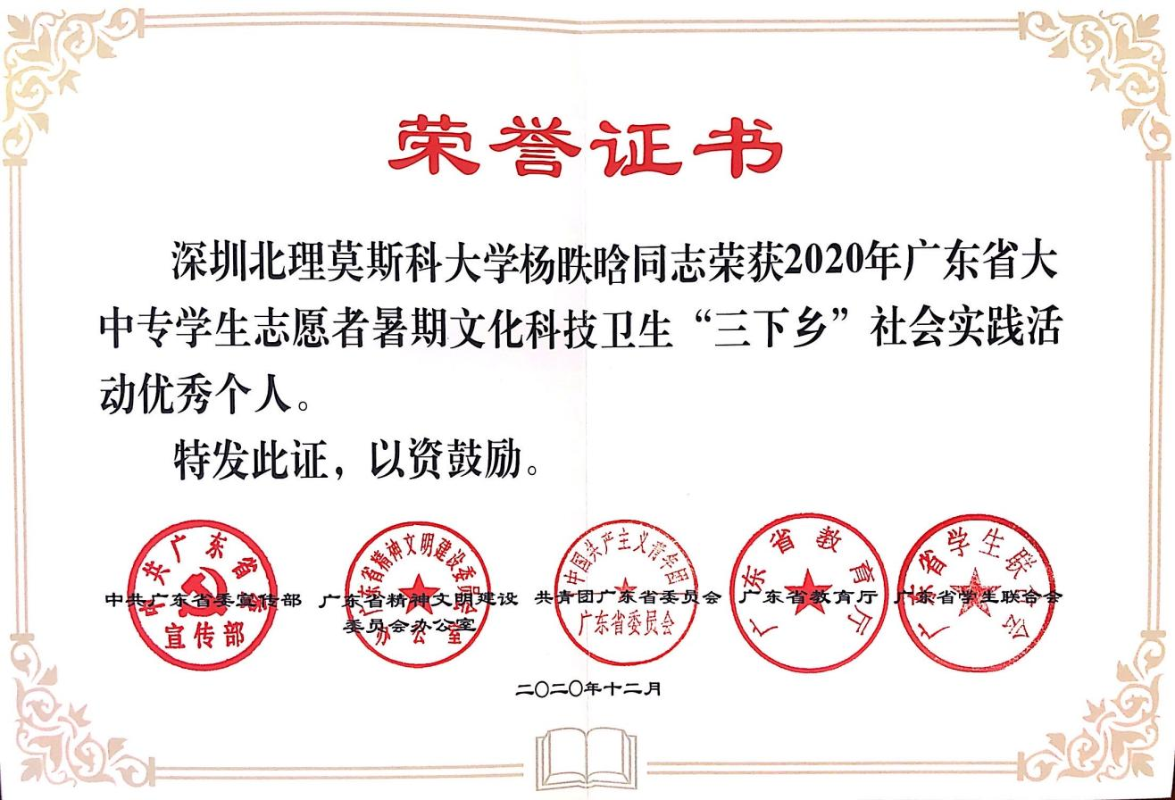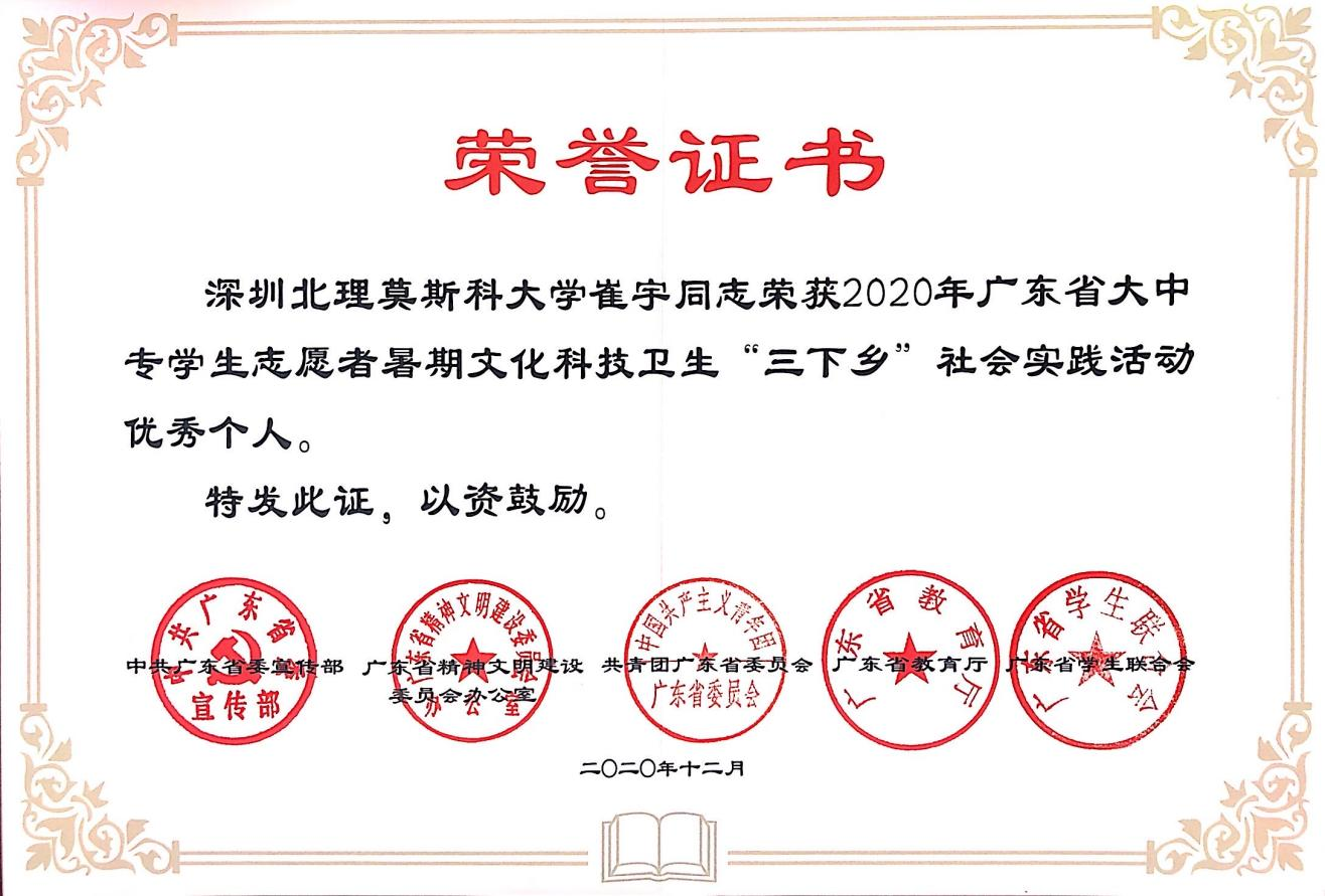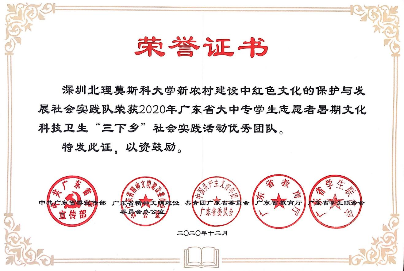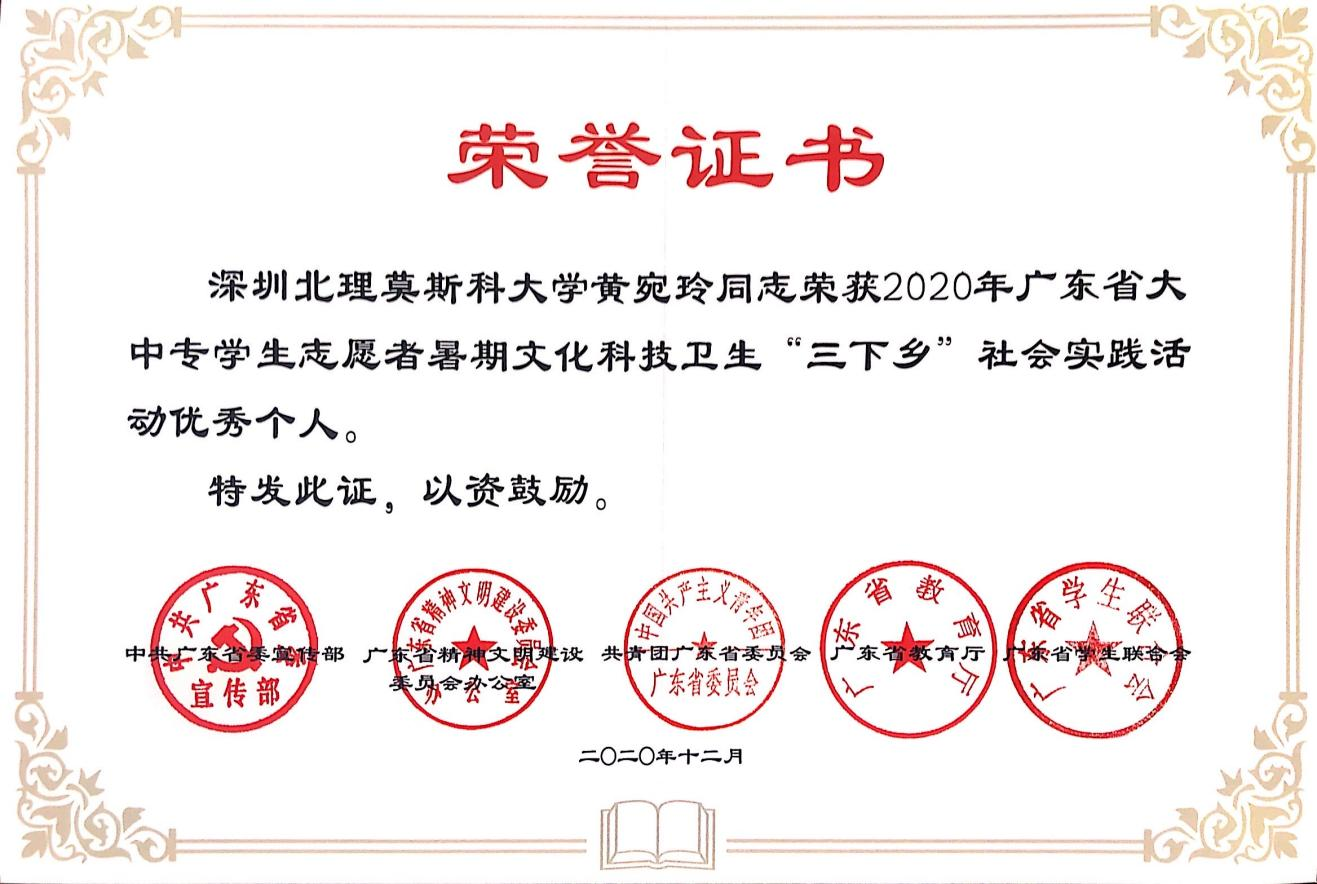 在此次评定中,我校崔宇、杨昳晗、黄宛玲荣获2020年广东省大中专学生志愿者暑期“三下乡”社会实践活动优秀个人称号,我校荣获优秀团队称号。