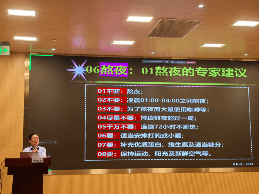 在生物节律方面,刘铁榜教授向我们介绍了人体褪黑素的分泌情况和人体的理想作息时间,教授了褪黑素的适应症与用法,并从专家的视角告知我们熬夜的危害和不得不熬夜时的“五不要”“三要”,非常实用。