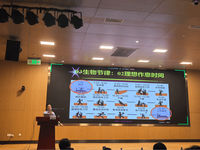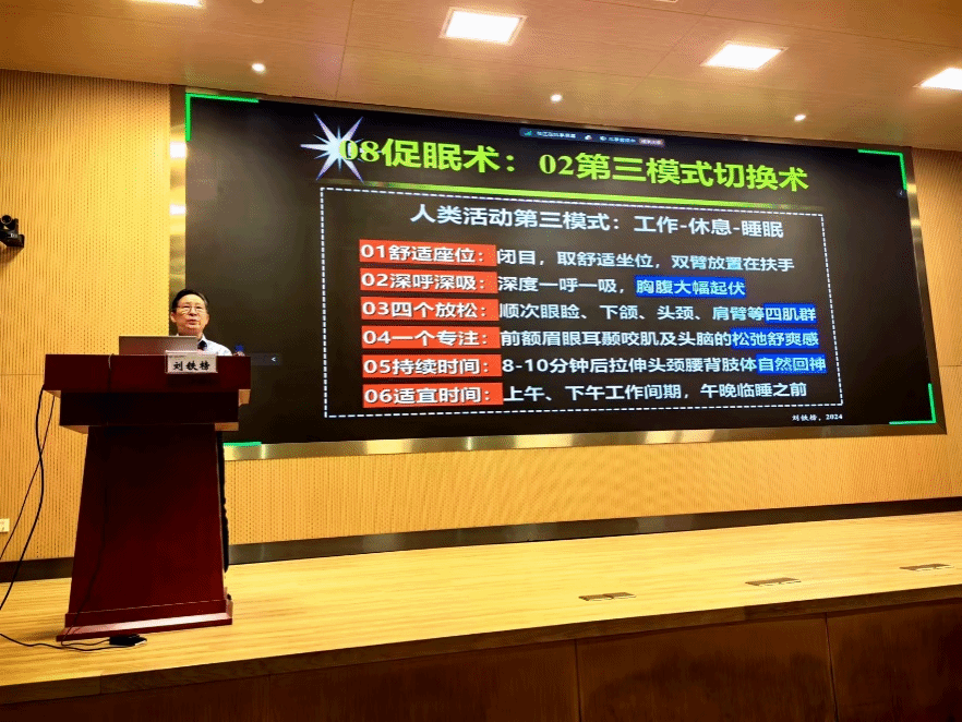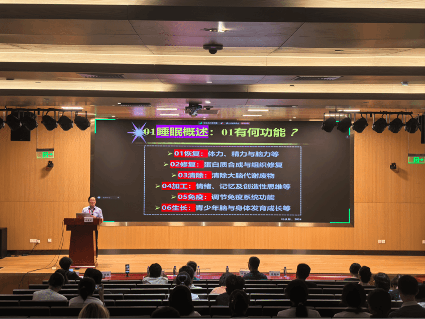 刘铁榜教授向同学们讲述了行为、睡眠与身心健康之间的关系及其重要性,对睡眠进行了功能概述、举例了学生最佳睡眠时间,并强调了睡眠所具有的恢复、修复、清除、加工、免疫、生长功能之重要作用。