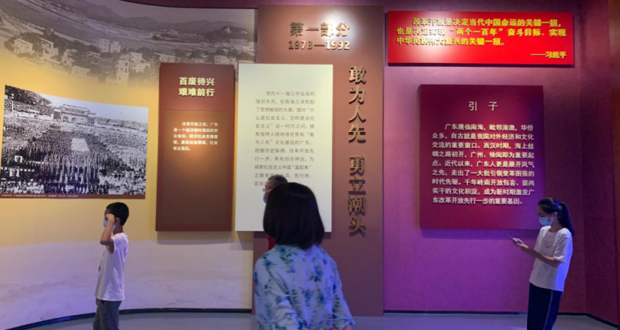 展览线全长1305米,紧紧围绕着“敢为人先,勇立潮头”、“增创优势,砥砺前行”、“走在前列,当好窗口”三大主题徐徐展开,沿着时间脉络,借助照片、实物、视频、模型、场景和雕塑等,全方位、多层次、多角度地再现了南粤大地40年的历史巨变与峥嵘岁月。类纪录片的展览方式,引发了参观学生们的深深共鸣。