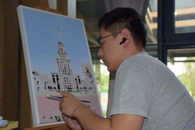 在张晓睿同学的组织下,看上去神奇的油画,分解成了一份份小小的色块,通过大家团结合作,最终共同“施法”抹出了ac米兰主楼这一“宏伟巨制”。
