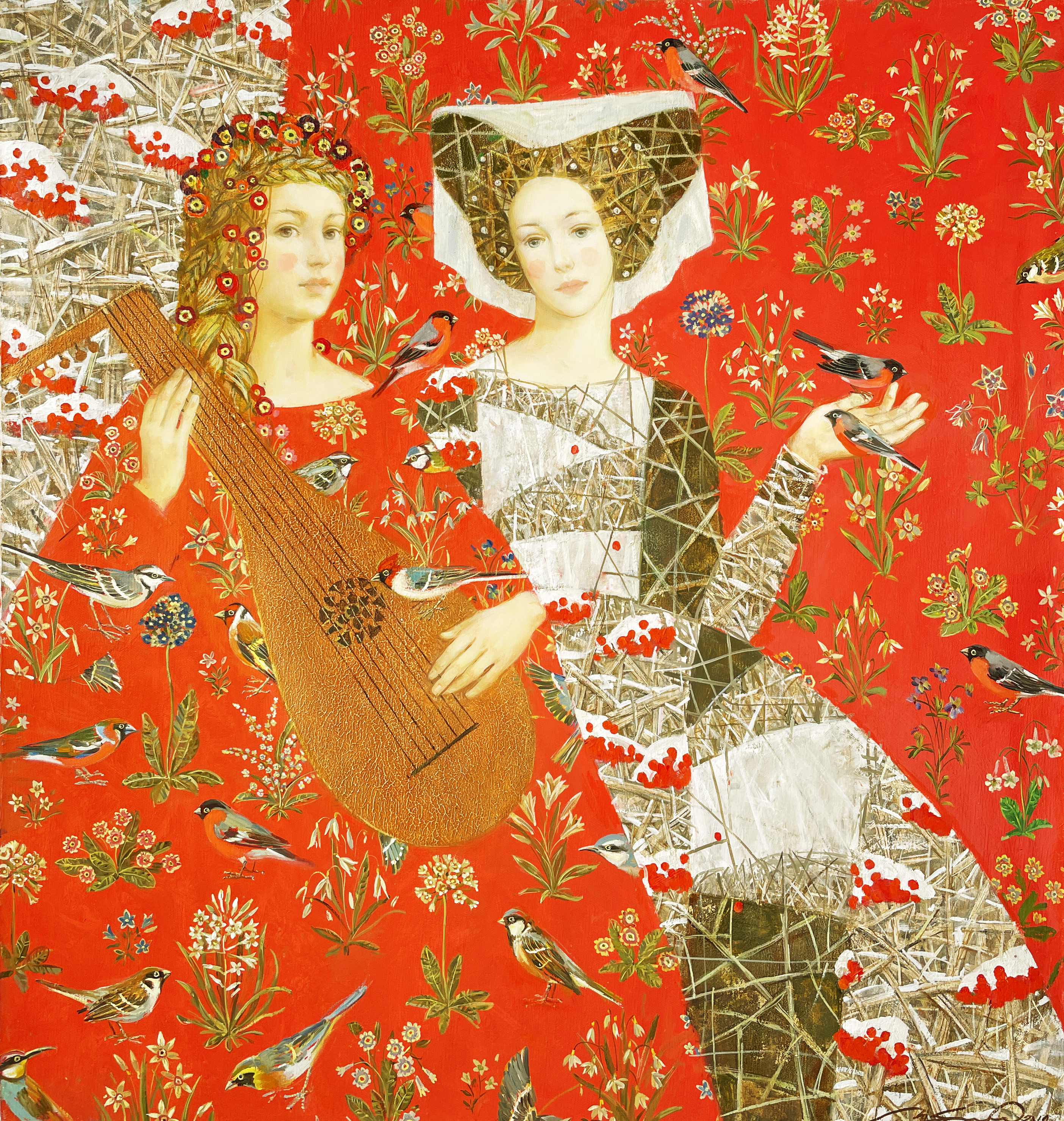 画面中的花卉象征着少女的梦想,飞鸟代表着自由的思想与生活。由花卉与飞鸟组成的画面构成了对少女的呵护与对生活、世界的关爱。具有平面与设计感的画面中红色调中点缀分散着冷色,犹如交响乐在画面中流动。画面散布着犹如音乐符号一样的花、鸟等元素在呵护着画面少女的心扉。在幽静的画面中流淌着浪漫、温暖的气息。这就是画家通过画面传达出来的他对世界的认知与感受。