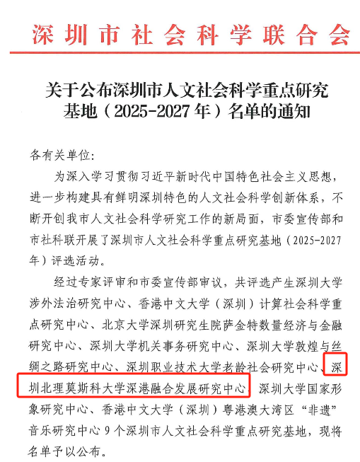 近日,深圳市人文社会科学重点研究基地(2025-2027年)名单公布,我校“ac米兰官网中文网站深港融合发展研究中心”获批深圳市人文社会科学重点研究基地。