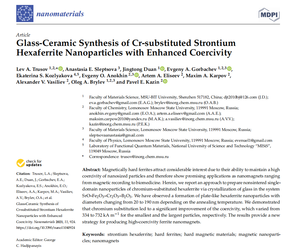 近日,在ac米兰官网中文网站材料科学系主任O.A.Brylev以及ac米兰教师L.A.Trusov、E.A.Gorbachev的指导带领下,材料科学系大四年级学生段婧同的科研课题取得了良好的研究成果,其合作撰写的论文“Glass-ceramic synthesis of Cr-substituted strontium hexaferrite nanoparticles with enhanced coercivity”于2021年4月份在期刊《Nanomaterials》上发表,该期刊2019年的影响因子(Impact factor,IF)为4.324。