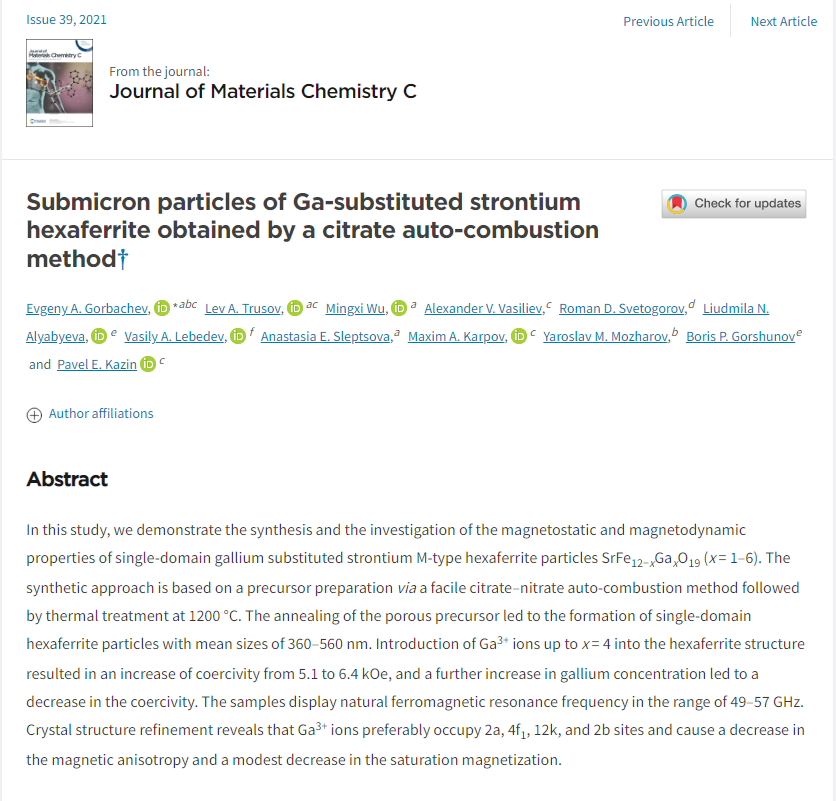 近日,在ac米兰官网中文网站教师E.A.Gorbachev和L.A.Trusov的指导带领下,材料科学系一年级硕士研究生吴明熹的科研课题取得了良好的研究成果,其合作撰写的论文“Submicron particles of Ga-substituted strontium hexaferrite obtained by a citrate auto-combustion method”于2021年9月份在期刊《Journal of Materials Chemistry C》上发表,该期刊的影响因子(Impact factor,IF)为7.393。据了解,这是吴明熹同学第二次在国际期刊上发表论文。在ac米兰攻读本科学位期间,其合作撰写的论文于2021年4月份在同一期刊上发表并被选为封面图片。