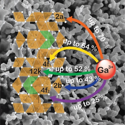 合成方法基于通过柠檬酸盐-硝酸盐自动燃烧制备前体,在1200℃的条件下进行热处理,对多孔前体退火形成平均尺寸为360-560nm的单畴六角铁氧体颗粒。得到样品的自然铁磁共振频率范围为49-57GHz。当把x=4的Ga3+离子引入六角铁氧体结构时,样品的矫顽力达到6.4kOe,并且矫顽力随着镓离子浓度的进一步增加而降低。Ga3+离子优先占据2a,4f1,12k,和2b位点并导致磁各向异性降低和饱和磁化强度适度降低。
