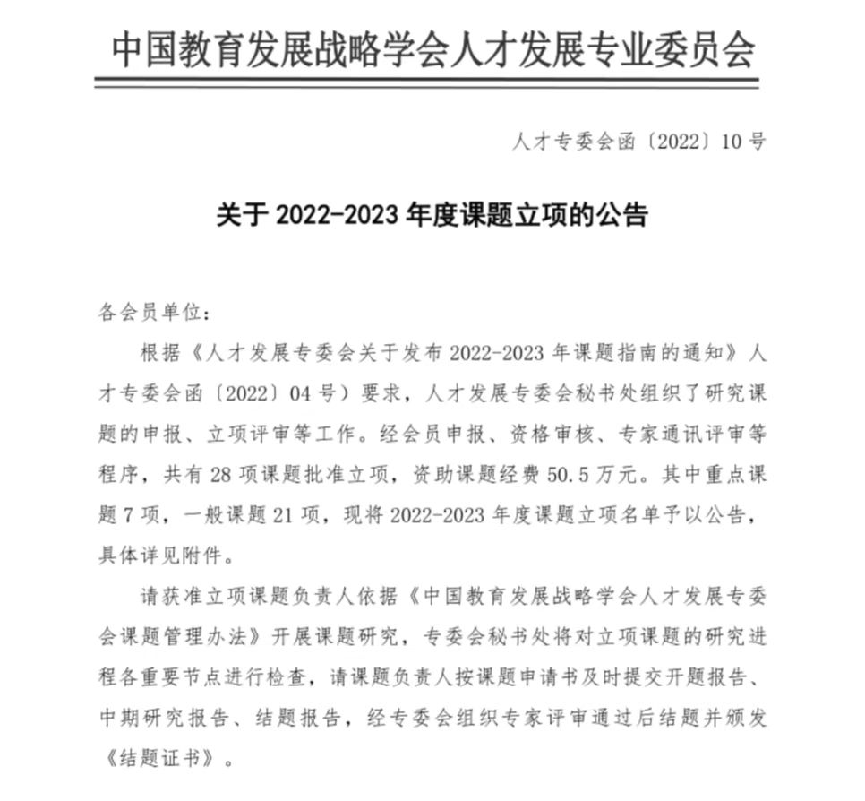 近日,中国教育发展战略学会人才发展专业委员会发布关于2022-2023年度课题立项的公告。经会员申报、资格审核、专家通讯评审等程序,共有28项课题脱颖而出,获批准立项。