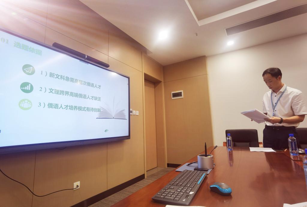 本次开题评议专家组由国内学界知名专家北京师范大学刘娟教授、北京外国语大学李向东教授、大连外国语大学彭文钊教授、广东外语外贸大学杨可教授、国防科学技术大学马建光教授担任。语言系主任、莫斯科大学列杰涅夫教授致欢迎辞,学校部分青年教师和研究生参加开题报告会。