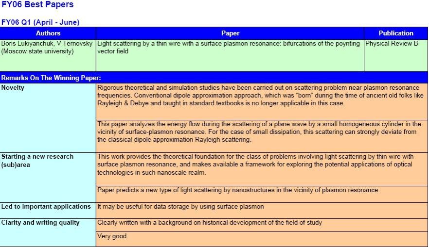 2. B.S. Luk`yanchuk1,2,, Z B Wang1, M Tribelsky3, V Ternovsky4, M H Hong1 and T C Chong “Peculiarities of light scattering by nanoparticles and nanowires near plasmon resonance frequencies” Journal of Physics: Conference Series, COLA '05: The 8th International Conference on Laser, 6 pages