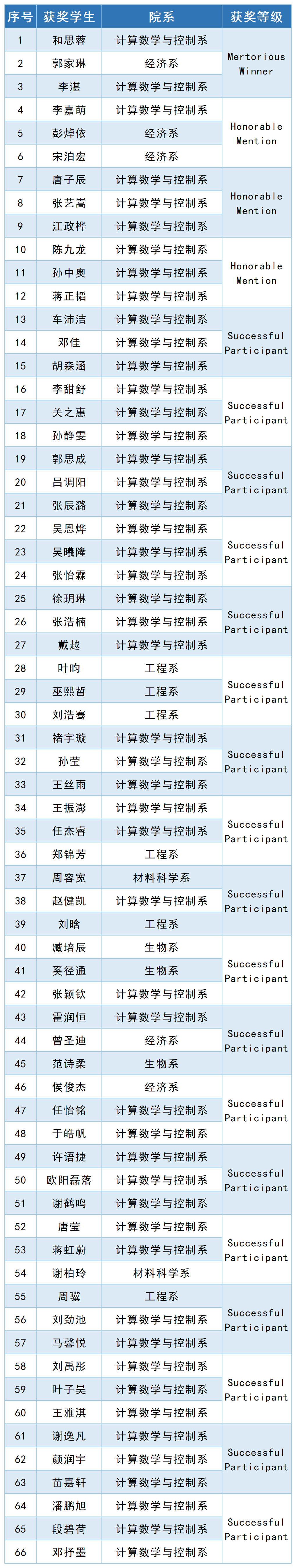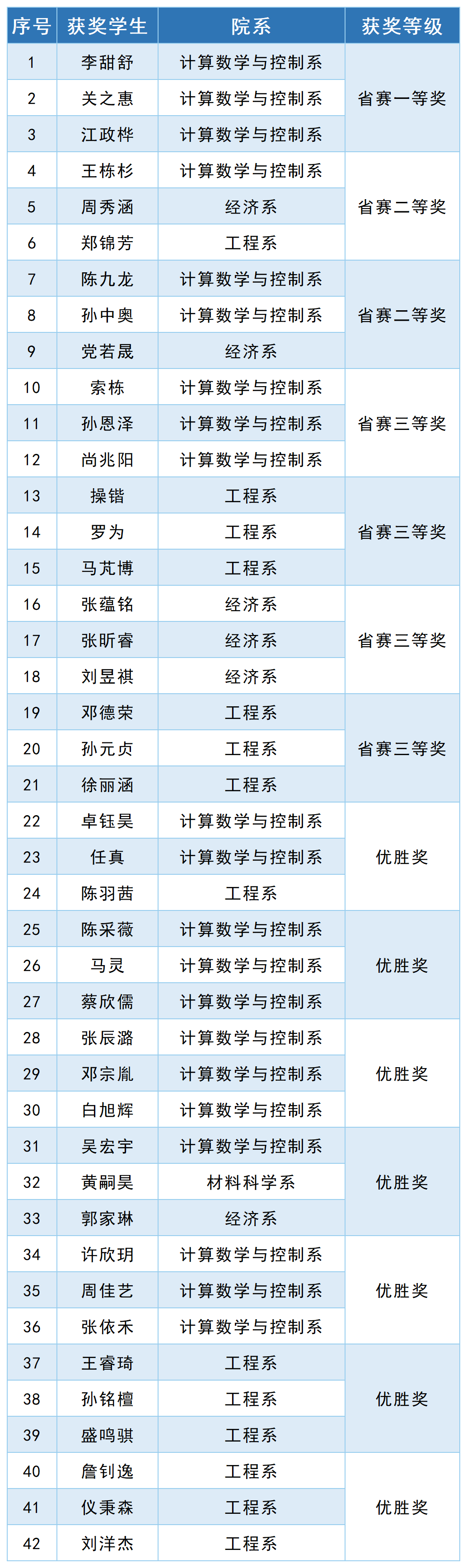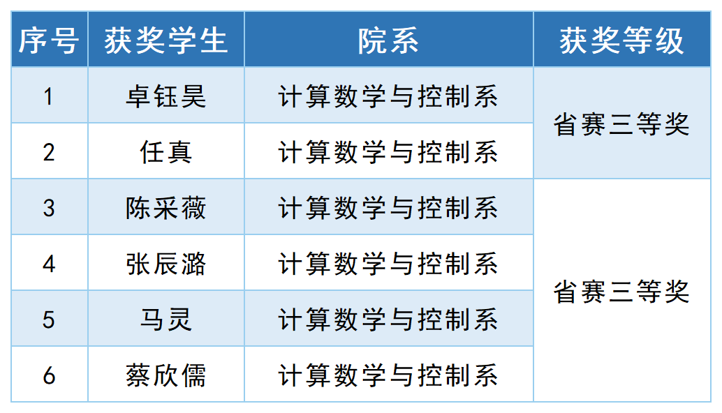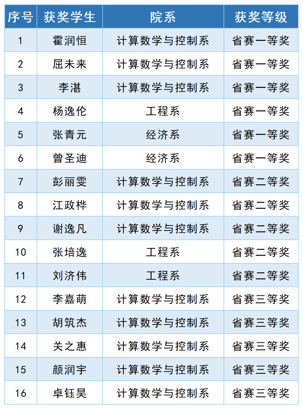在2022年全国大学生数学建模竞赛中,学校共有14支队伍获奖,与2021年相比,共增加8支获奖队伍。其中,1支队伍获得省赛一等奖,2支队伍获得省赛二等奖,4支队伍获得省赛三等奖,其余队伍获得优胜奖。其中,省赛一等奖的获奖队伍是来自计算数学与控制系的三名学生李甜舒、关之惠与江政桦。