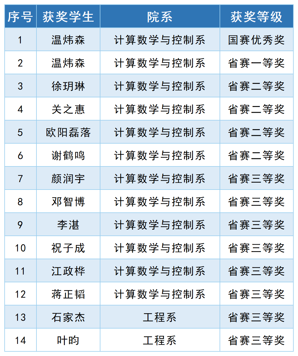 在第十三届“蓝桥杯”软件编程大赛中,共有14名学生荣获奖项,计算数学与控制系学生温炜森获得国赛优秀奖与省赛一等奖。