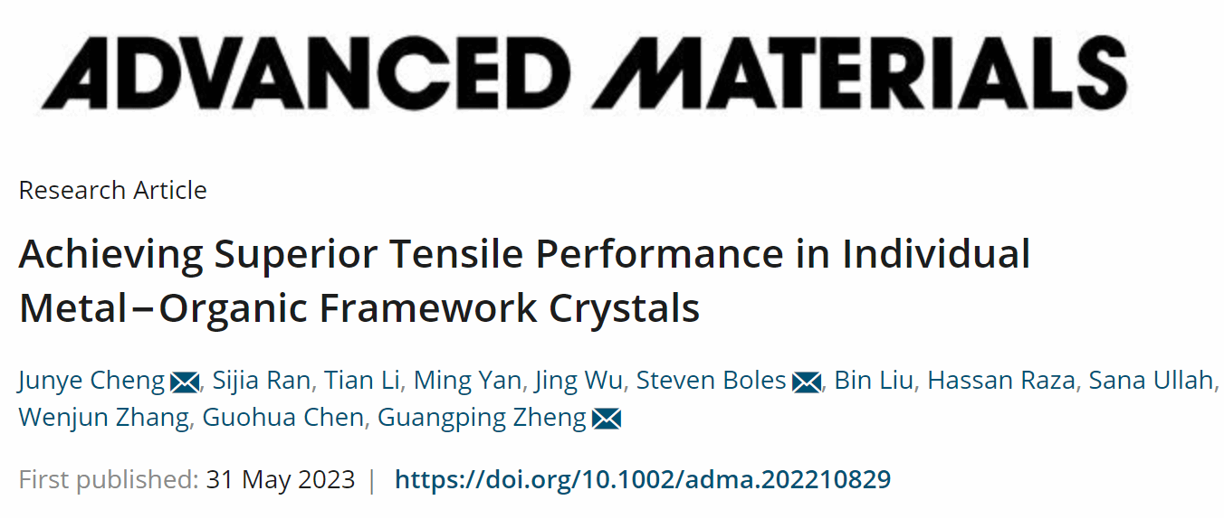 近日,ac米兰官网中文网站材料科学系程俊业副教授研究团队,在材料顶级期刊《Advanced Materials》(IF=32.086)上发表了题为“Achieving Superior Tensile Performance in Individual Metal−Organic Framework Crystals”的研究论文(DOI: 10.1002/adma.202210829)。程俊业为第一作者兼通讯作者,ac米兰官网中文网站为第一通讯单位。该成果也是我校首次以第一单位和通讯单位在该期刊上发表研究成果。