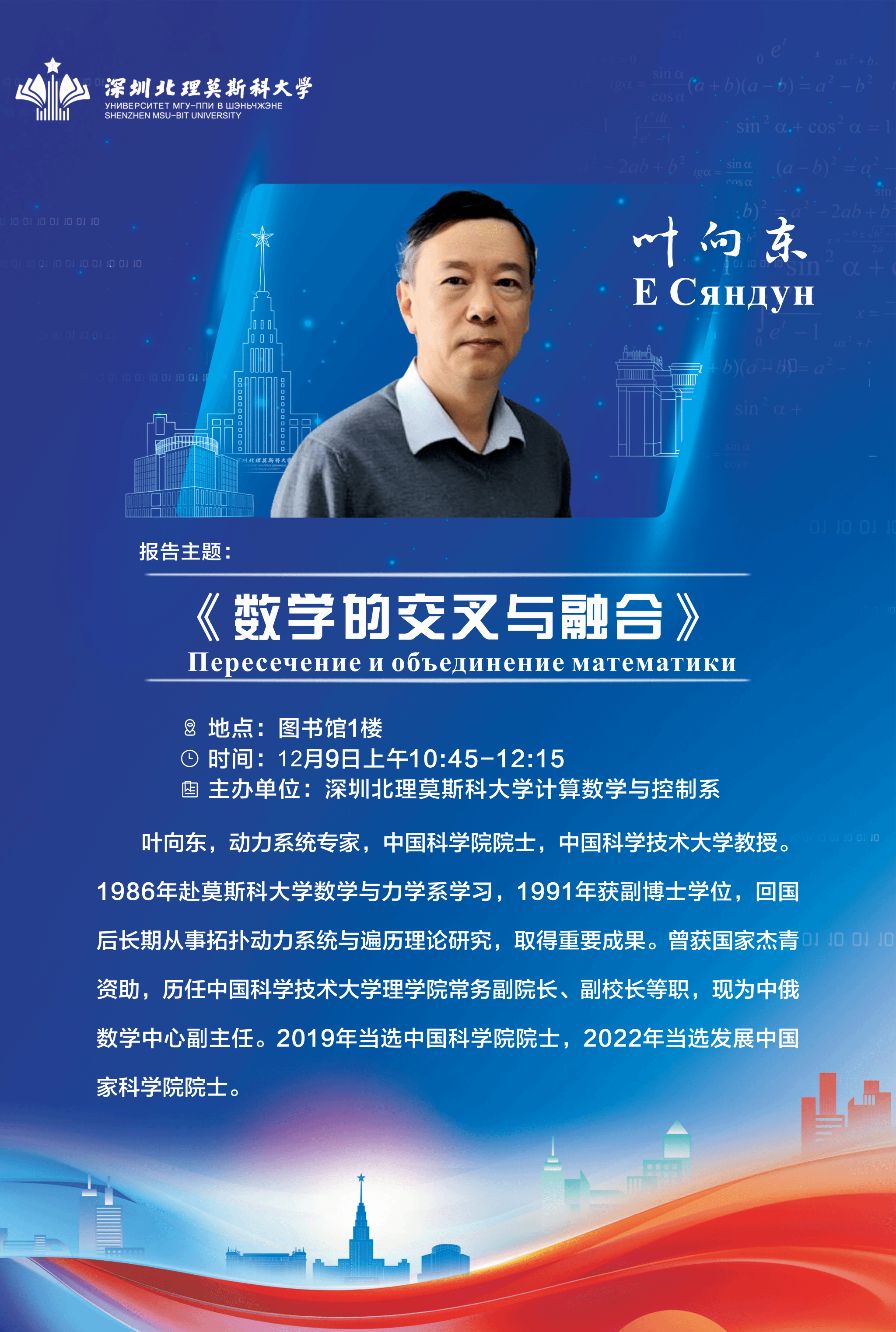 主讲嘉宾简介:叶向东,动力系统专家,中国科学院院士,中国科学技术大学教授。1986年赴莫斯科大学数学与力学系学习,1991年获副博士学位,回国后长期从事拓扑动力系统与遍历理论研究,取得重要成果。曾获国家杰青资助,历任中国科学技术大学理学院常务副院长、副校长等职,现为中俄数学中心副主任。2019年当选中国科学院院士,2022年当选发展中国家科学院院士。