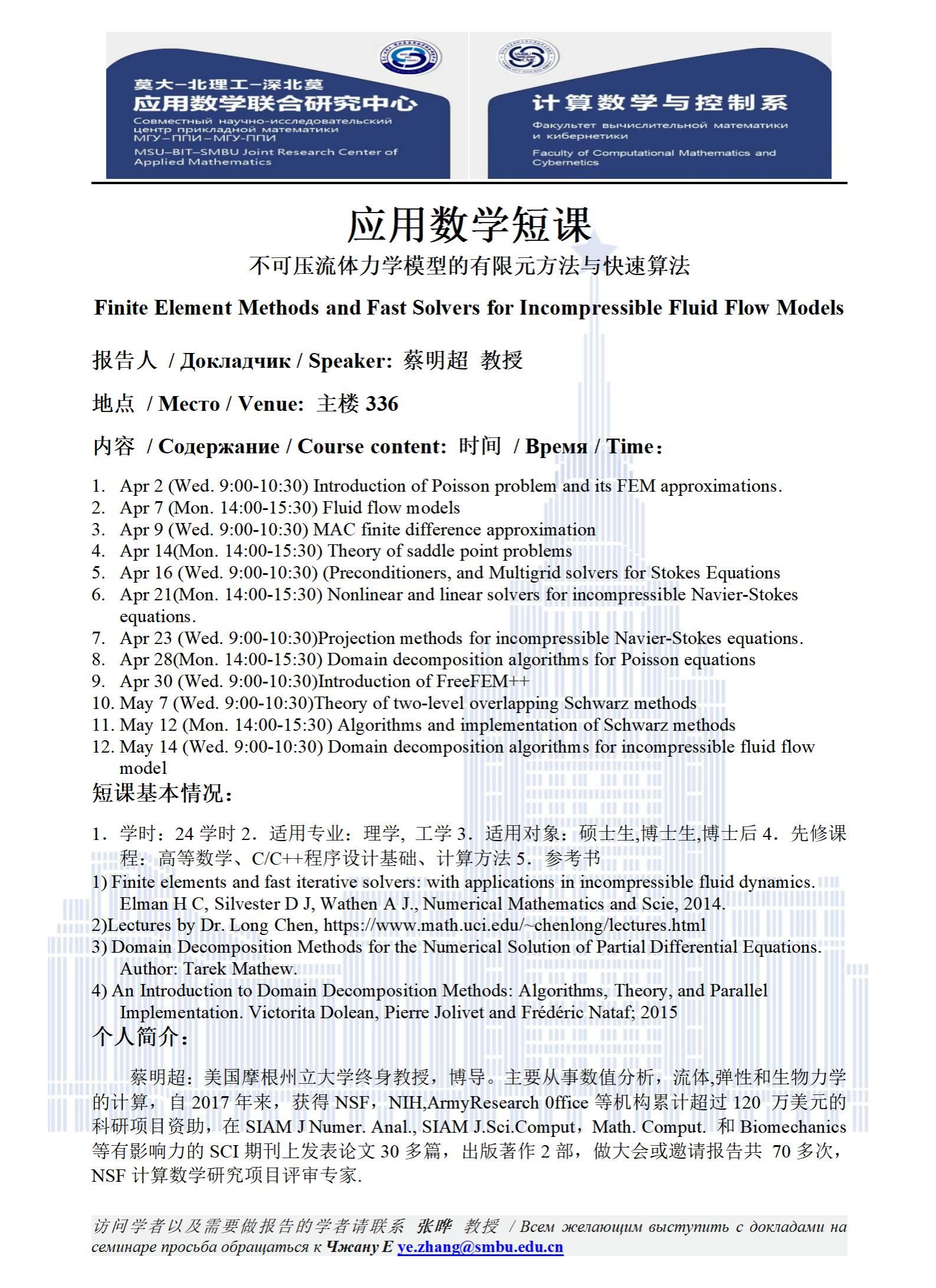 蔡明超:美国摩根州立大学终身教授,博导。主要从事数值分析,流体,弹性和生物力学的计算,自2017年来,获得NSF,NIH,ArmyResearch 0ffice等机构累计超过120 万美元的科研项目资助,在SIAM J Numer. Anal., SIAM J.Sci.Comput,Math. Comput. 和Biomechanics等有影响力的SCI期刊上发表论文30多篇,出版著作2部,做大会或邀请报告共 70多次,NSF计算数学研究项目评审专家.