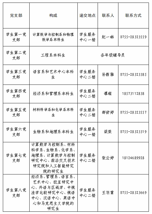 2.请于3月3日(周一)12:00前将纸质版入党申请书,根据下方表格递交至各系各年级对应学生党支部处。
