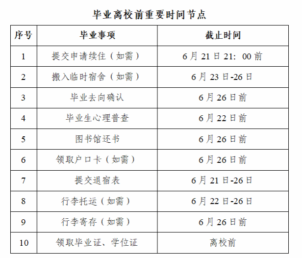 毕业生须在6月26日前办理退宿手续,并最迟于6月26日17:30前搬离宿舍,以便宿舍维修、保洁和秋季开学工作的顺利开展。毕业生离校前应将房间清理干净,为学弟学妹留下文明整洁的住宿环境。