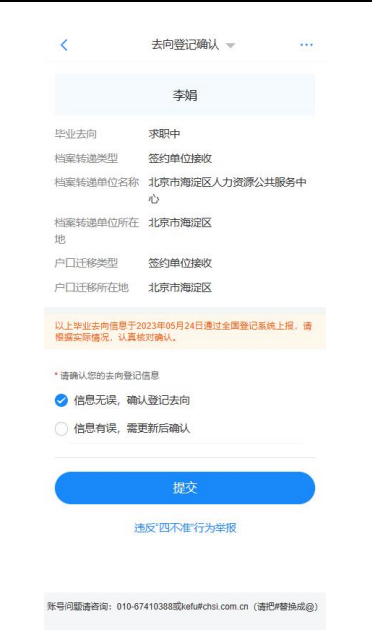 (1)若信息无误,选择“信息无误,确认登记去向”提交。