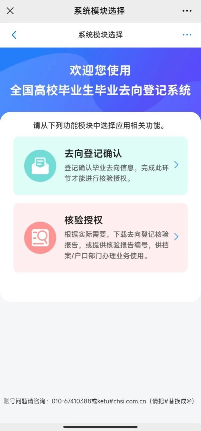 进入选择功能模块界面。“去向登记确认”用于登记确认毕业去向信息。