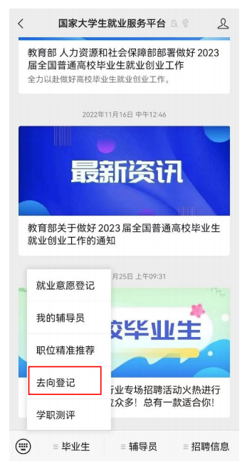 关注绑定“国家大学生就业服务平台”公众号,点击“去向登记”直接登录。