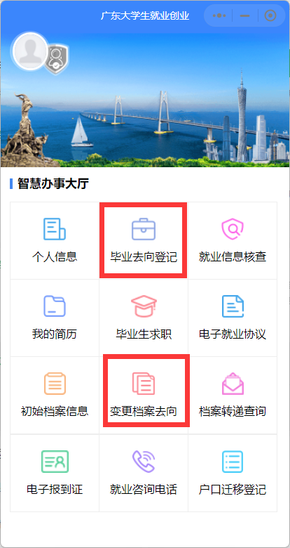 毕业生选择进入“去向登记确认”模块。注意:毕业生需在微信“广东大学生就业创业”小程序完成毕业去向上报才能进行确认。毕业生核对确认本人毕业去向、档案转递等信息是否正确。