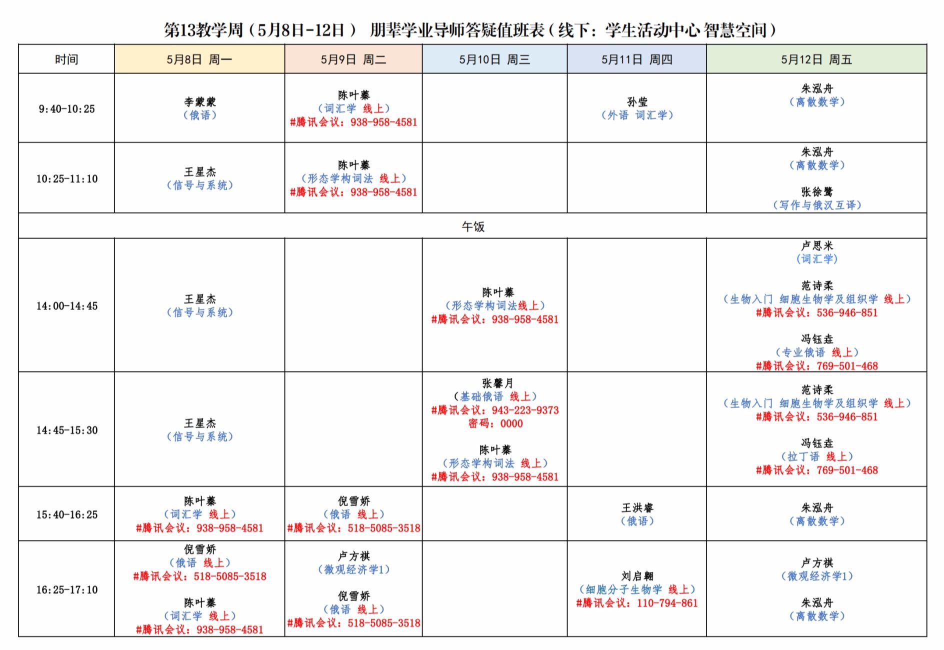 附件:第13教学周(5月8日-12日) 朋辈学业导师答疑值班表