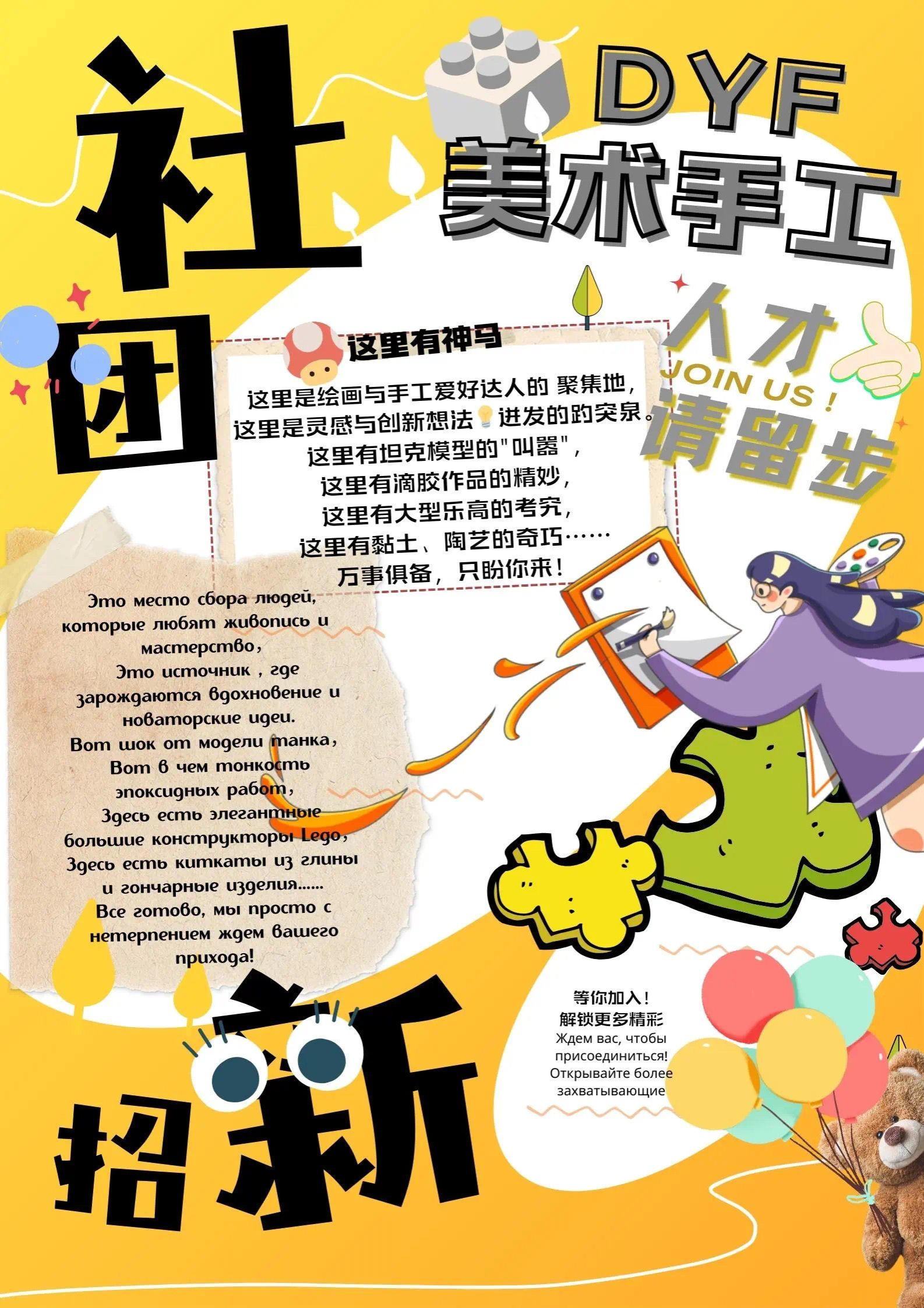DYF手工美术社团是属于МГУ ППИ的艺术活动类社团,是我校学生自愿组成,为实现成员共同意愿,按照其章程开展活动的协会。绘画社团是隶属于学校团总支的社团组织之一,是加强学生课余文化生活,促进校园文化建设、培养学生个性发展的有利窗口,展现学生才华的艺术团体。社团定期举行如拼装模型,制作制品,合作绘画等各种各样的手工制作或者绘画活动,也积极承担大学集体活动摊位,保证学生课余时间的多样性。