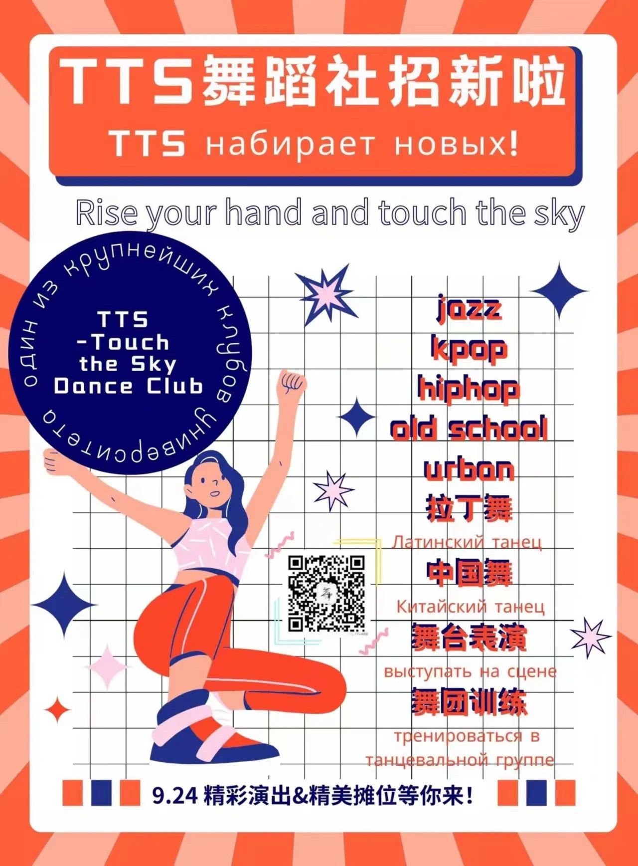 Вы можете научиться к-поп, джазу, китайским танцам и другим танцам в танцевальном клубе TTS и принять участие в выступлениях.