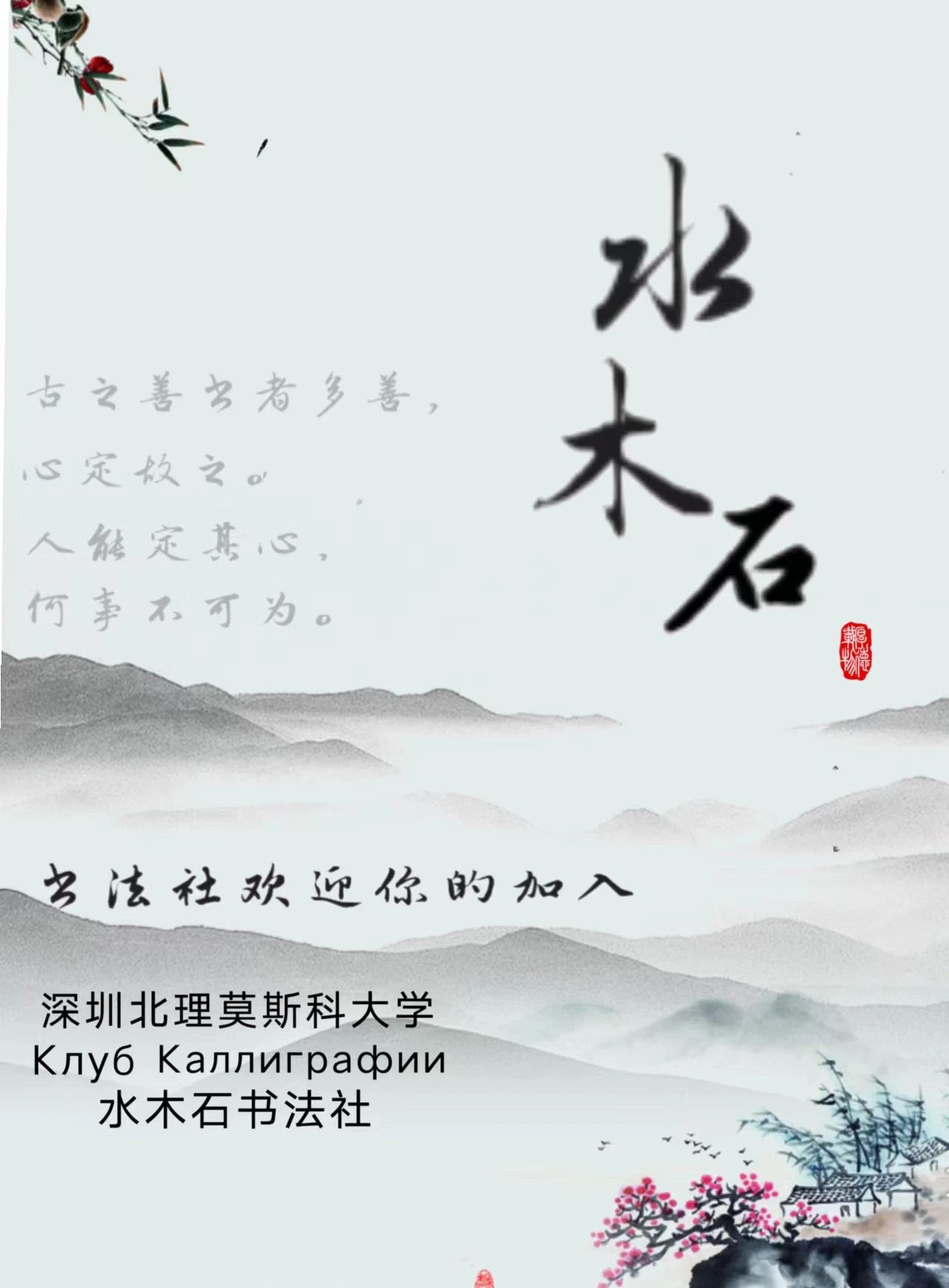 挥毫寻好友,泼墨引知音。水木石书法社成立于2017年建校之初,是一个传承中华传统书法文化的社团。“水木石”三字源自中国传统书法文化的书写原料,一盒砚,一毛笔,一宣纸,寓意追根溯源、延续本源。我社致力于通过社团活动传播、传承中华书法文化,发扬中国艺术之美、文化之精华,让来自中国、俄罗斯、乃至世界各地的人了解中华文化、感受中华之美本社举办过多种活动,包括:承办“南粤青年心向党,执笔青春绘梦想”书法比赛校级选拔赛;举办“为党献礼,共创锦绣”校级书法比赛;庆元旦活动;中秋游园会; “我爱我校”文创嘉年华等深受同学喜爱的活动。