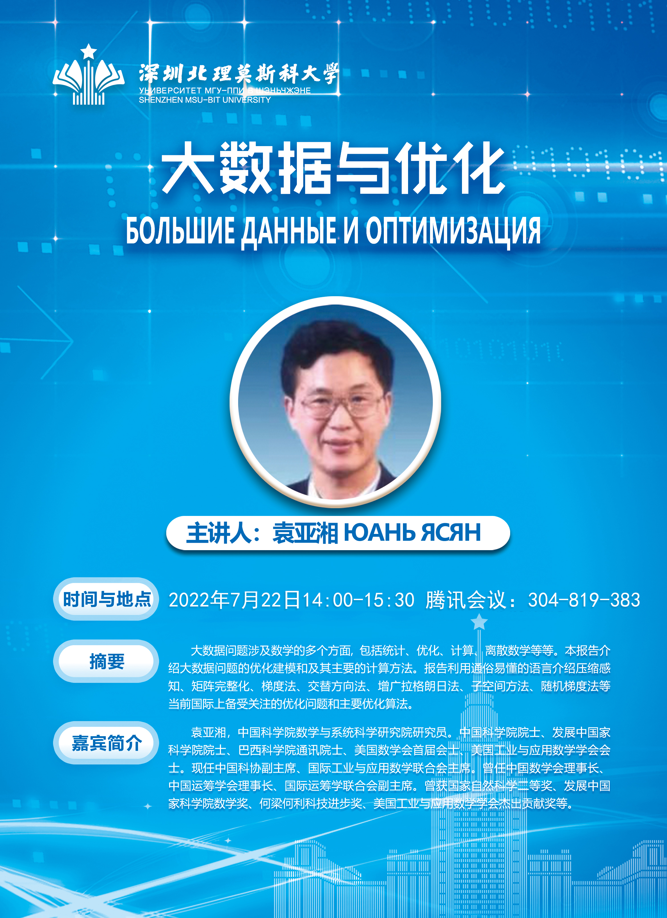 ➢ 大师讲座 ————— 袁亚湘 院士 (22 Jul. 2022, 14:00-15:30)