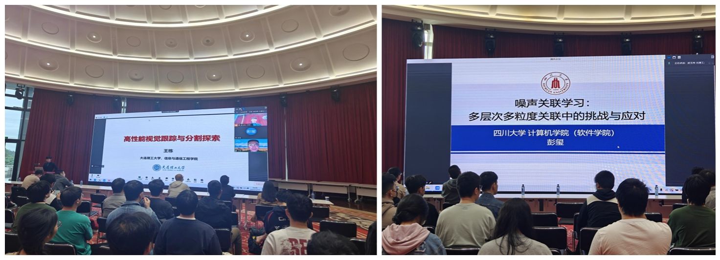 4位特邀讲者围绕智能感知与计算的前沿进展,分别做了深入噪声关联学习:多粒度关联中的挑战与应对”、“高性能视觉跟踪与分割探索”、“深层概率分布建模网络设计、理解及应用”和“低质目标增强与感知”的报告。四川大学彭玺教授的报告从不同粒度、不同层次的角度介绍了噪声关联学习的最新进展,分析其中的挑战及解决策略。大连理工大学王栋教授的报告从模板和搜索区域特征融合、跟踪分割协同及嵌入式平台部署需求等方面介绍了高性能视觉跟踪与分割的最新进展。中山大学任文琦教授针对成像过程中模糊、雨雾、低分辨率、低动态范围等不同质量退化的成因,分别介绍了针对性的解决方案以及兼顾下游低质与伪装目标检测效果增益的图像恢复算法。天津大学王旗龙教授的报告介绍了一类深层概率分布建模网络,其旨在结合深度学习和概率机器学习增强深度模型的泛化性、鲁棒性和可解释性。