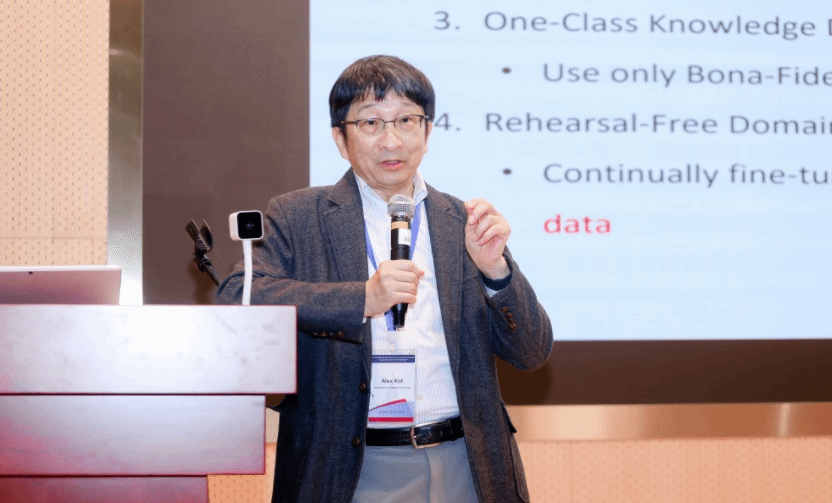 Alex Kot教授的特邀报告题目为“Presentation Attack via Face-Spoofing”,深入探讨了面部识别系统中的安全挑战,特别是呈现攻击问题,强调了在不同领域测试中保持方法有效性的重要性,并介绍了他们团队在非监督领域适应和非对称模态转换技术方面的最新进展,以增强面部反欺骗的泛化能力。