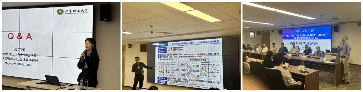 刘滨教授分享了基于自然语言处理的生物序列分析方法。刘滨教授长期从事交叉学科研究,针对生物序列、结构、功能与疾病的应用关系分析等,提出了基于自然语言处理的生物序列分析方法,在本次青年学者研讨会分享了他们课题组在生物序列语法表示、生物序列语义检测、生物序列语用分析等方面的研究进展,介绍了他们提出的生物序列语言模型、生物序列语义相似度计算方法和动态语境网络分析方法等。然后和与会的同学们讨论了关于AI for science中大模型、数据的动态变化等方面的研究技术,给大家带来了交叉学科研究的新思路、新方法。